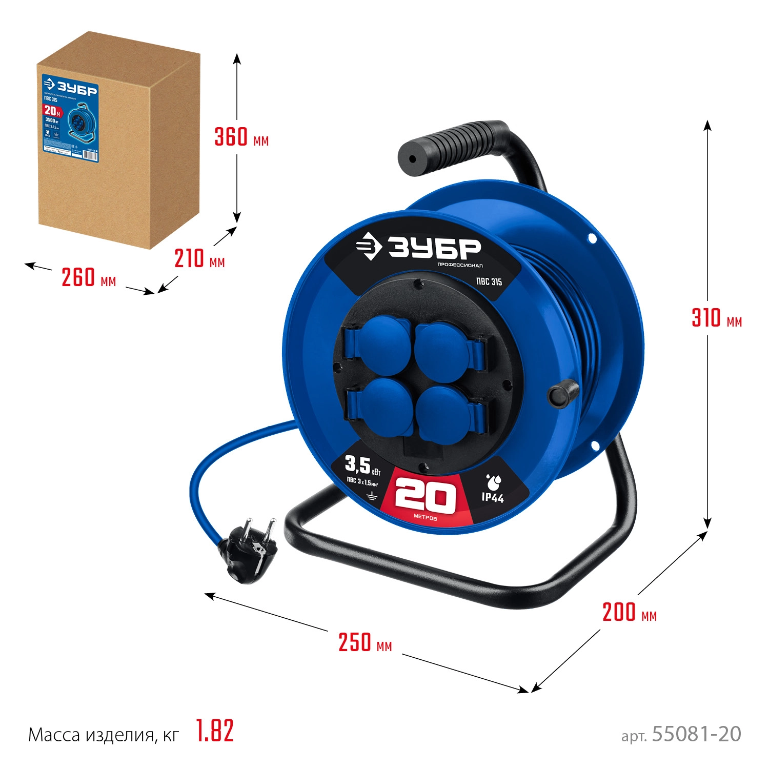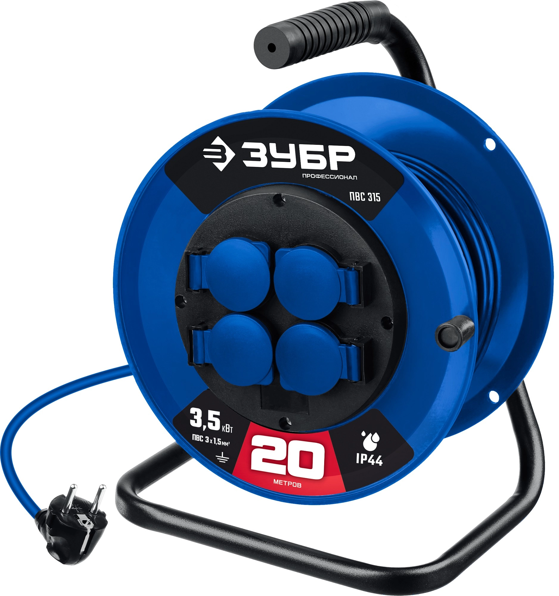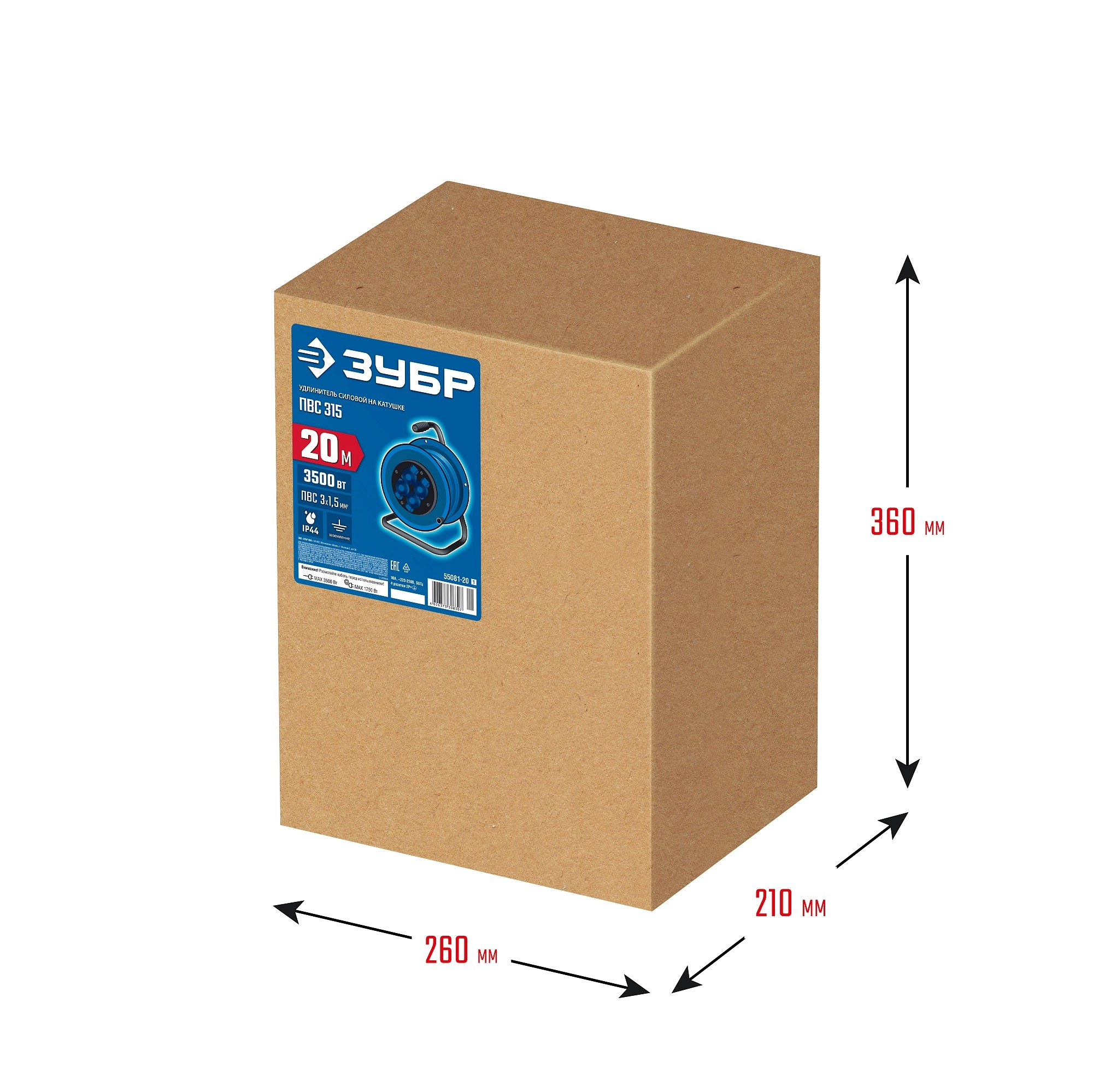 ПроизводителиУдлинитель силовой на катушке ПВС-315, ПВС, 3х1.5мм2, 20 м, 3500 Вт, IP44 (55081-20_z01) ЗУБР