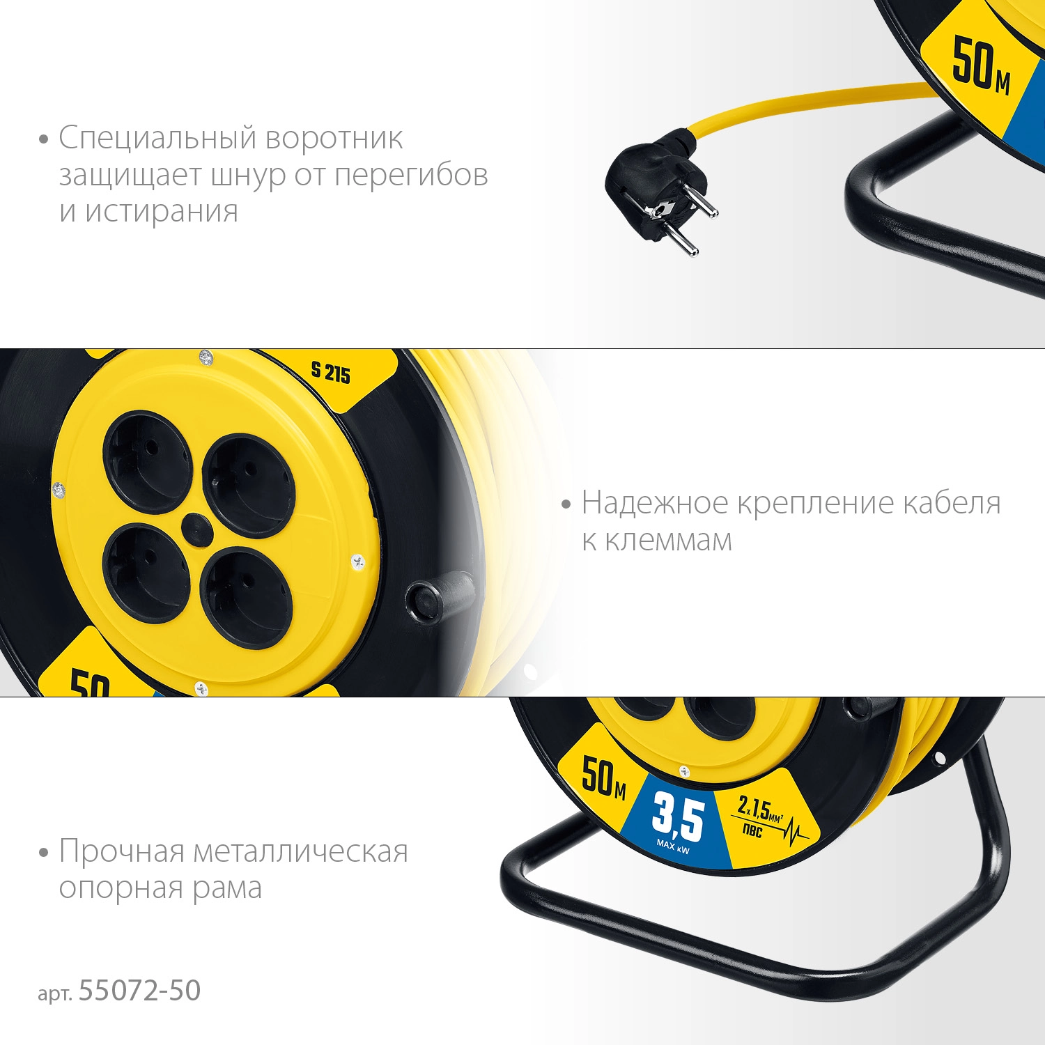 ПроизводителиУдлинитель силовой на катушке S-215, ПВС, 2х1.5мм2, 50 м, 3500 Вт (55072-50) STAYER
