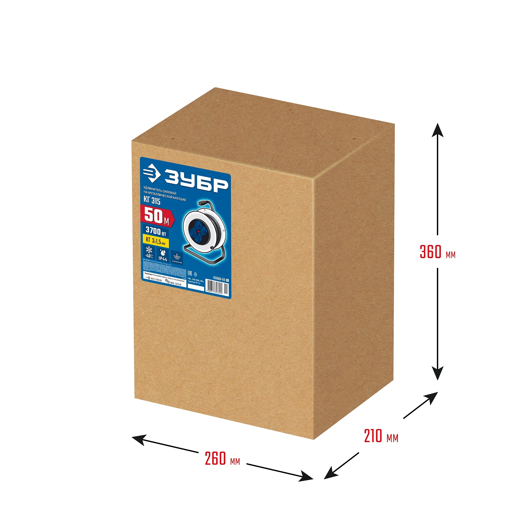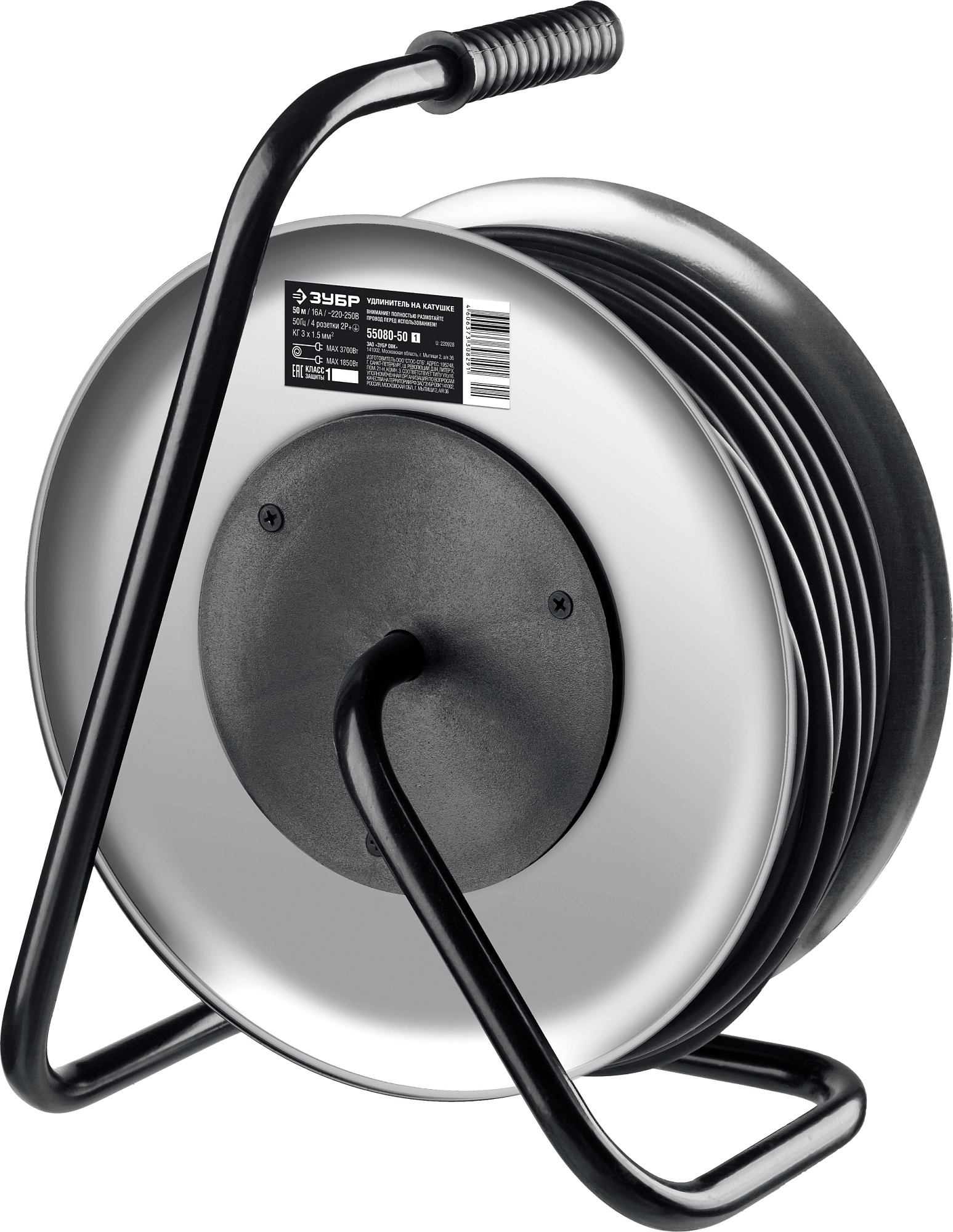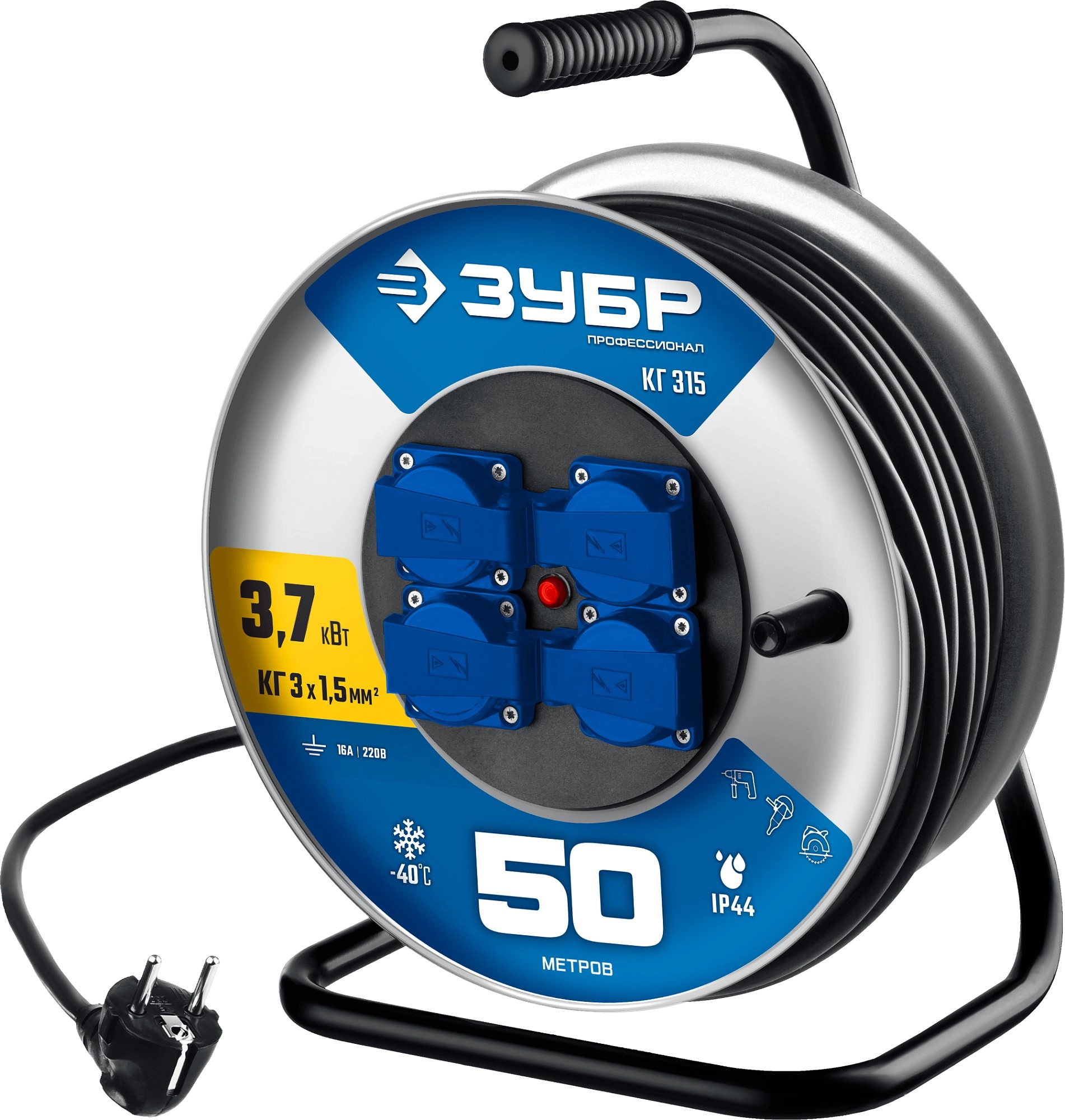 ПроизводителиУдлинитель силовой на стальной катушке КГ-315,кг, 3х1.5мм2, 50 м, 3700 Вт, IP44 (55080-50_z01) ЗУБР