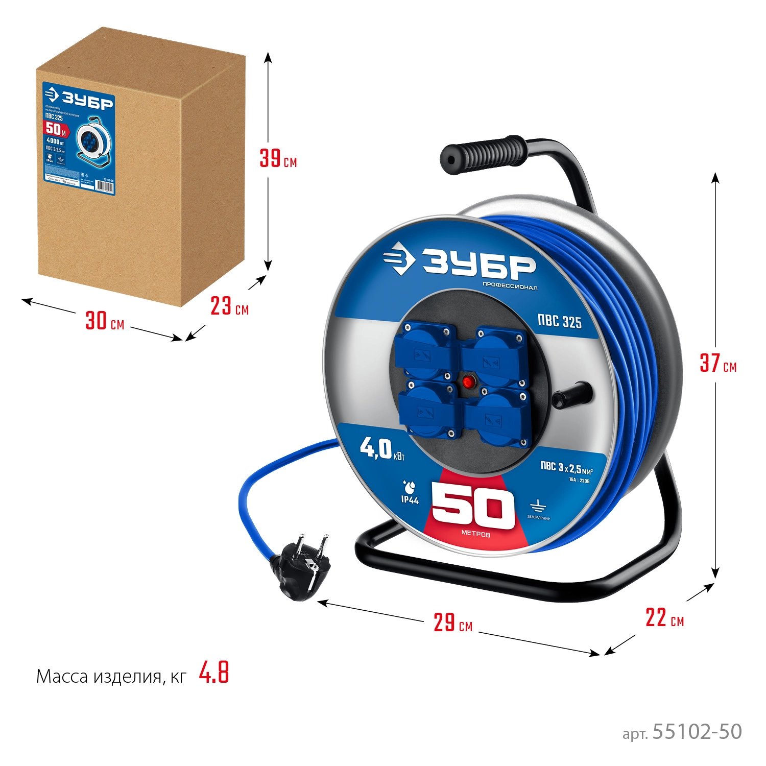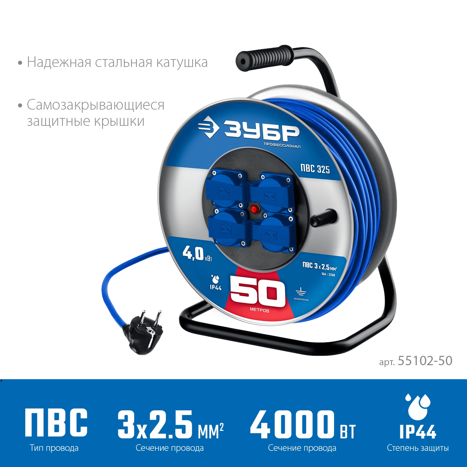 ПроизводителиУдлинитель силовой на стальной катушке ПВС-325, ПВС, 3х2.5мм2, 50 м, 4000 Вт, IP44 (55102-50) ЗУБР
