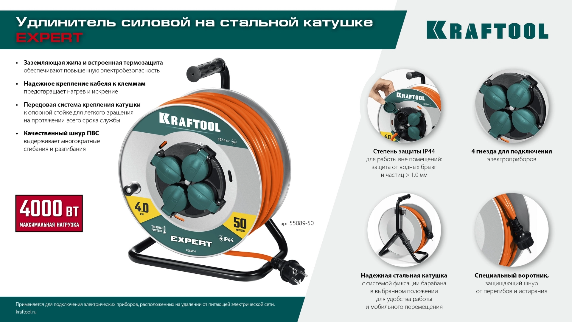 ПроизводителиУдлинитель силовой на стальной катушке ПВС 3х2.5 30м 4000Вт IP44, EXPERT (55089-30) KRAFTOOL