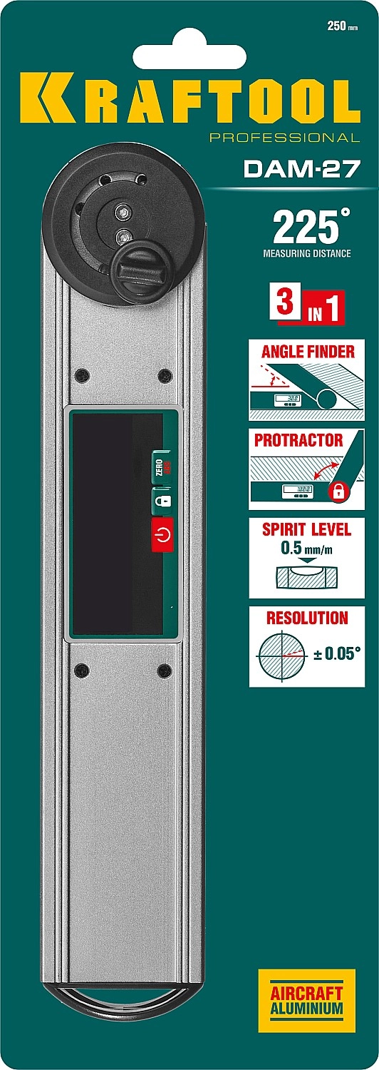 ПроизводителиУгломер электронный, 250 мм, диапазон 0-225°, точность ±0,05° DAM-27 (34684) KRAFTOOL
