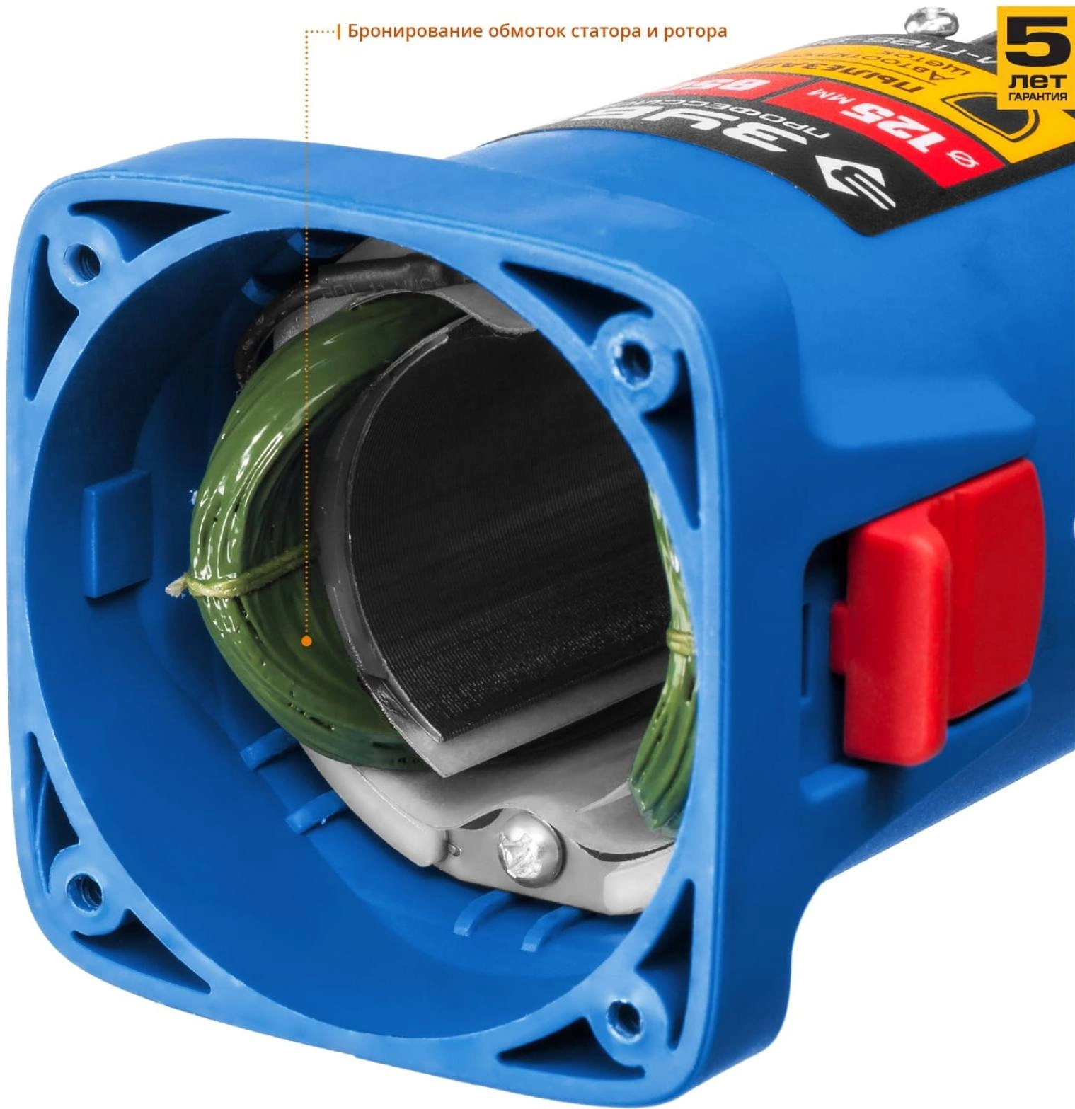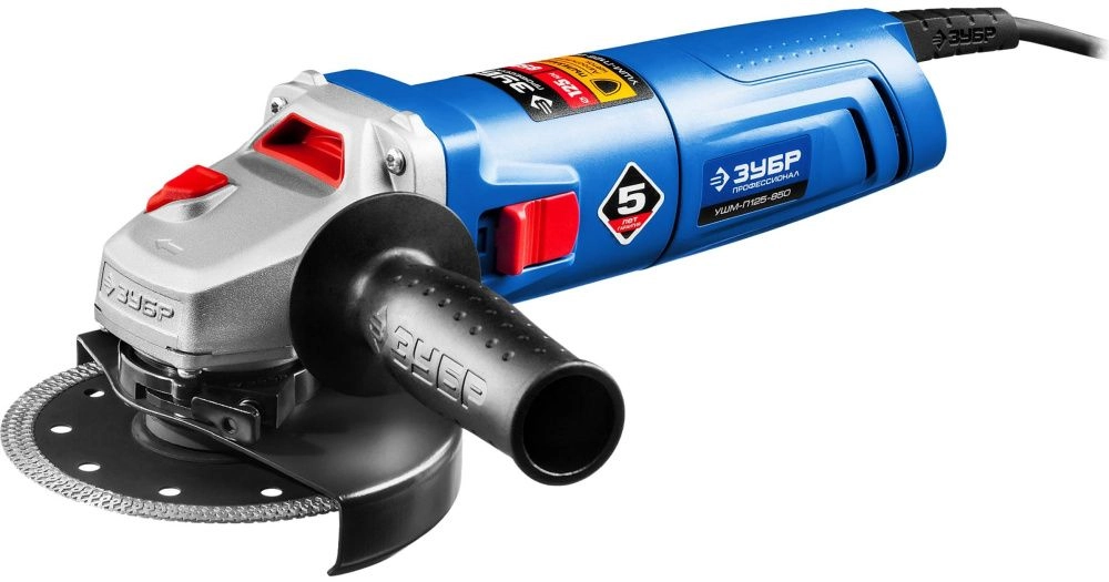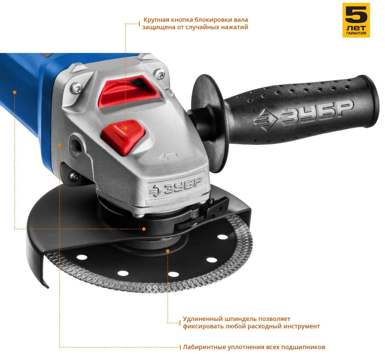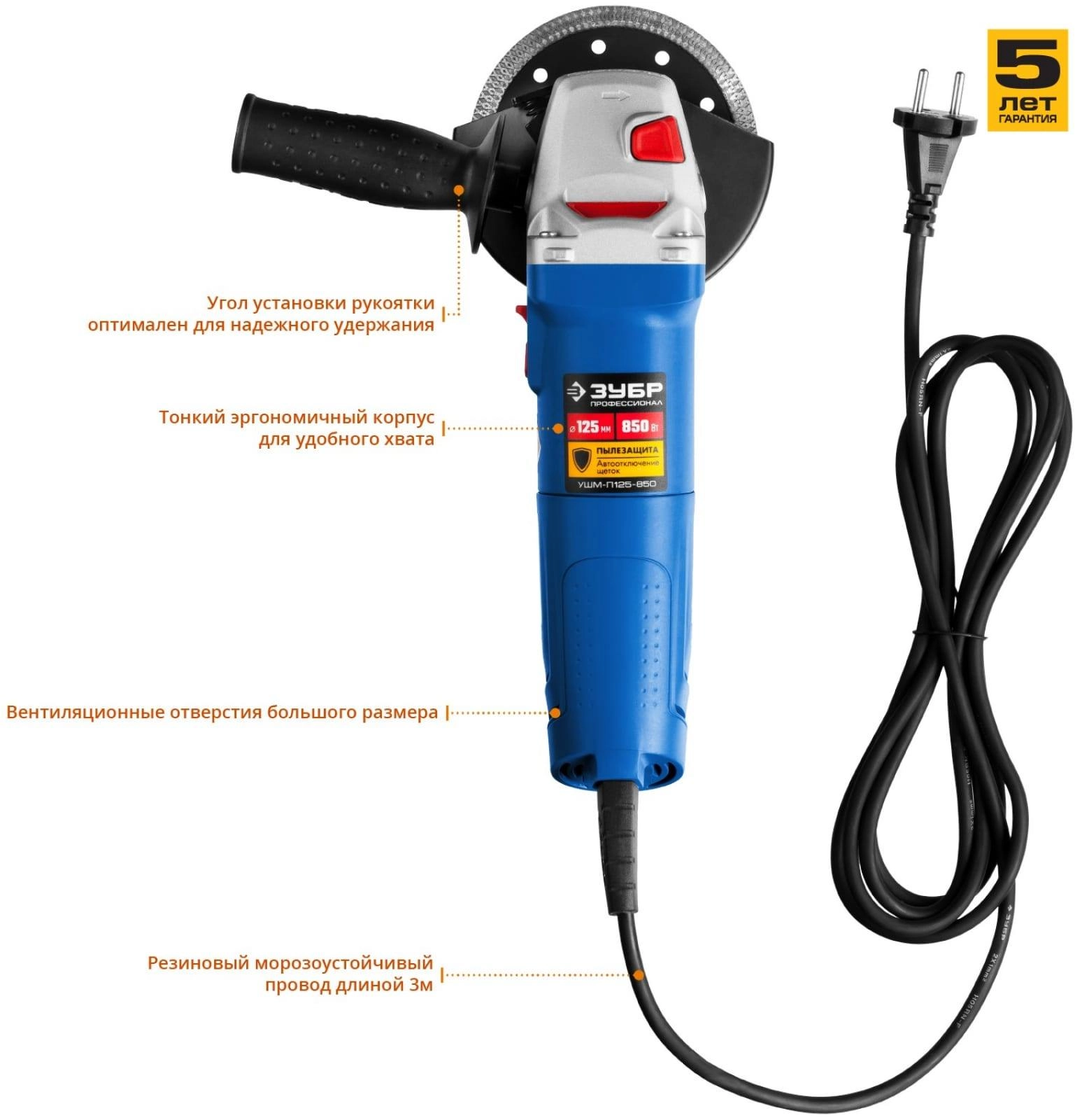ПРОФИУровень качества. При классификации продуктов, имеющих схожее наименование, но обладающие различными потребительскими свойствами мы приняли следующий Вес факторов: 80% - подтвержденный ресурс, 15% - заявленная производительность/скорость, 5% - субъективные ощущения потребителя. ПодробнееКод товара: 0031919ХарактеристикиАртикул УШМ-П125-850Бренды ЗубрСтрана производства КитайПотребляемая мощность 850Число оборотов холостого хода 11000Скорость вращения 11000Резьба шпинделя M14Макс. диаметр диска, мм 125Цвет серый/синий/черныйМатериал корпуса пластикДиаметр диска 125Длина сетевого шнура 3X-Lock нетКейс в комплекте нетДиаметр посадочного места 22.2Блокировка кнопки включения ДаТормоз двигателя НетБыстрозажимная гайка SDS НетВес 2.2Питание сетьКоличество отрезных дисков 1Полировальная машина нетРегулировка скорости оборотов нетКейс Нет«Константная» электроника нетОграничение пускового тока нетФиксация шпинделя естьЗащита от перегрузок НетСуперфланец ДаСистема стабилизации оборотов НетШирина 15Высота 11Патрубок для подключения пылесоса НетПрорезиненная рукоятка НетМаксимальная частота вращения диска 11000Съемный аккумулятор НетДополнительная рукоятка ДаТип рукоятки двухпозиционнаяГлубина 40Плавный пуск НетОписание товара обновлено 08.12.2025 14:27:54Угловая шлифмашина ЗУБР УШМ-П125-850, предназначена для зачистки, шлифовки и резки металлов, обработки бетона и камня при установке соответствующих шлифовальных, отрезных, алмазных кругов. Компактная универсальная модель для эффективной работы. Надежная защита основных узлов от пыли. Специально разработанный корпус редуктора для улучшения теплоотвода и обеспечения прочности самого нагруженного узла. Направляющий диффузор в системе обдува способствует стабильности температуры основных компонентов. Низкий уровень шума за счет редуктора с косозубыми коническими шестернями. Поворотная с шагом 90° голова позволяет настроить изделие под левую руку или для резки. Защитный кожух диска с мгновенной регулировкой положения удобным рычажком в одно движение. Блокировка шпинделя для быстрой замены диска. Фланцы из разного материала предотвращают чрезмерное затягивание диска при работе. Фирменная дополнительная рукоятка, устанавливаемая в 2 положениях. Простой доступ к щеткам для замены.Производитель: Крафтул И/Е Гмбх, Альтер Поствег Штр., Лоенинген, Германия