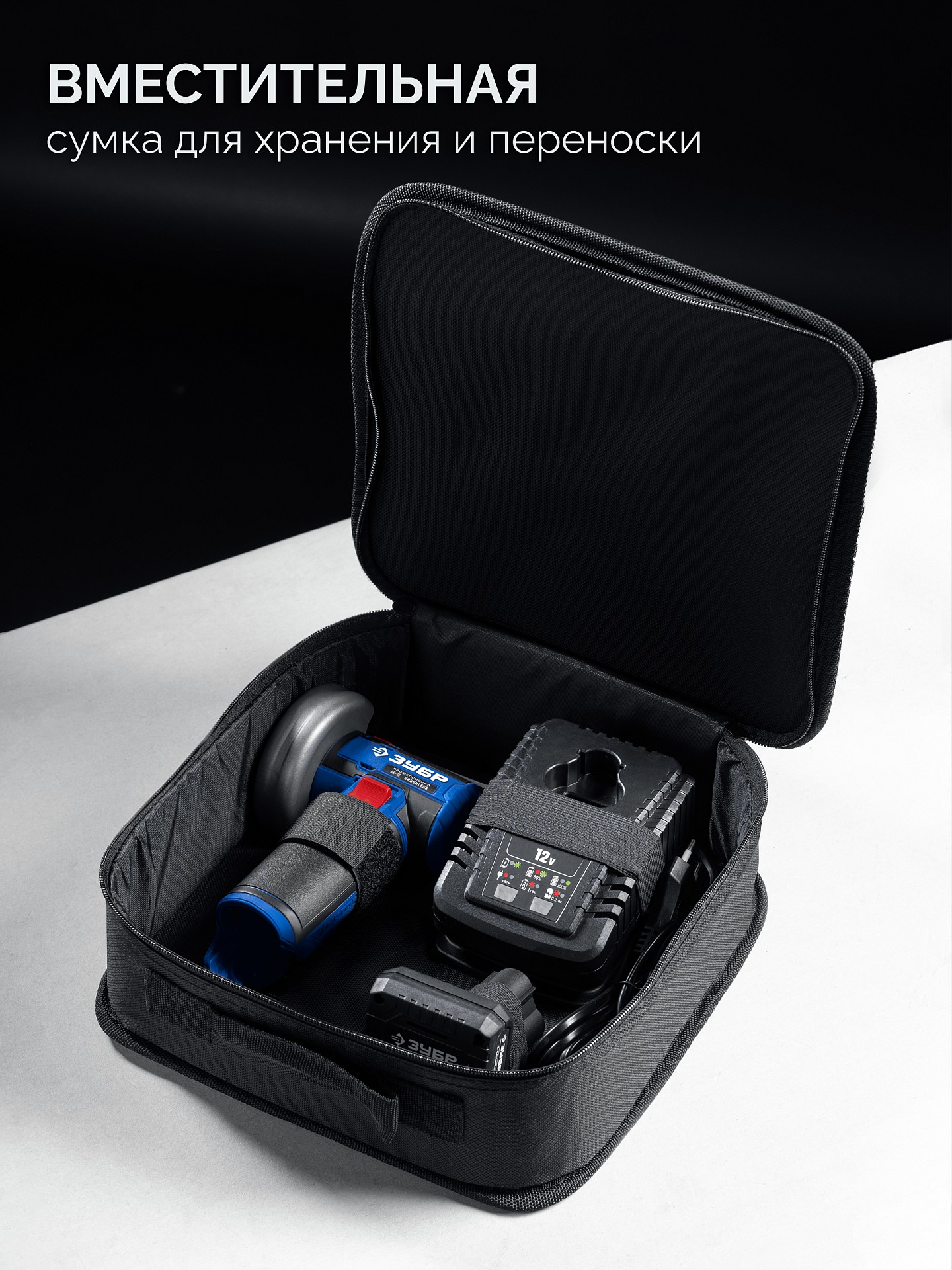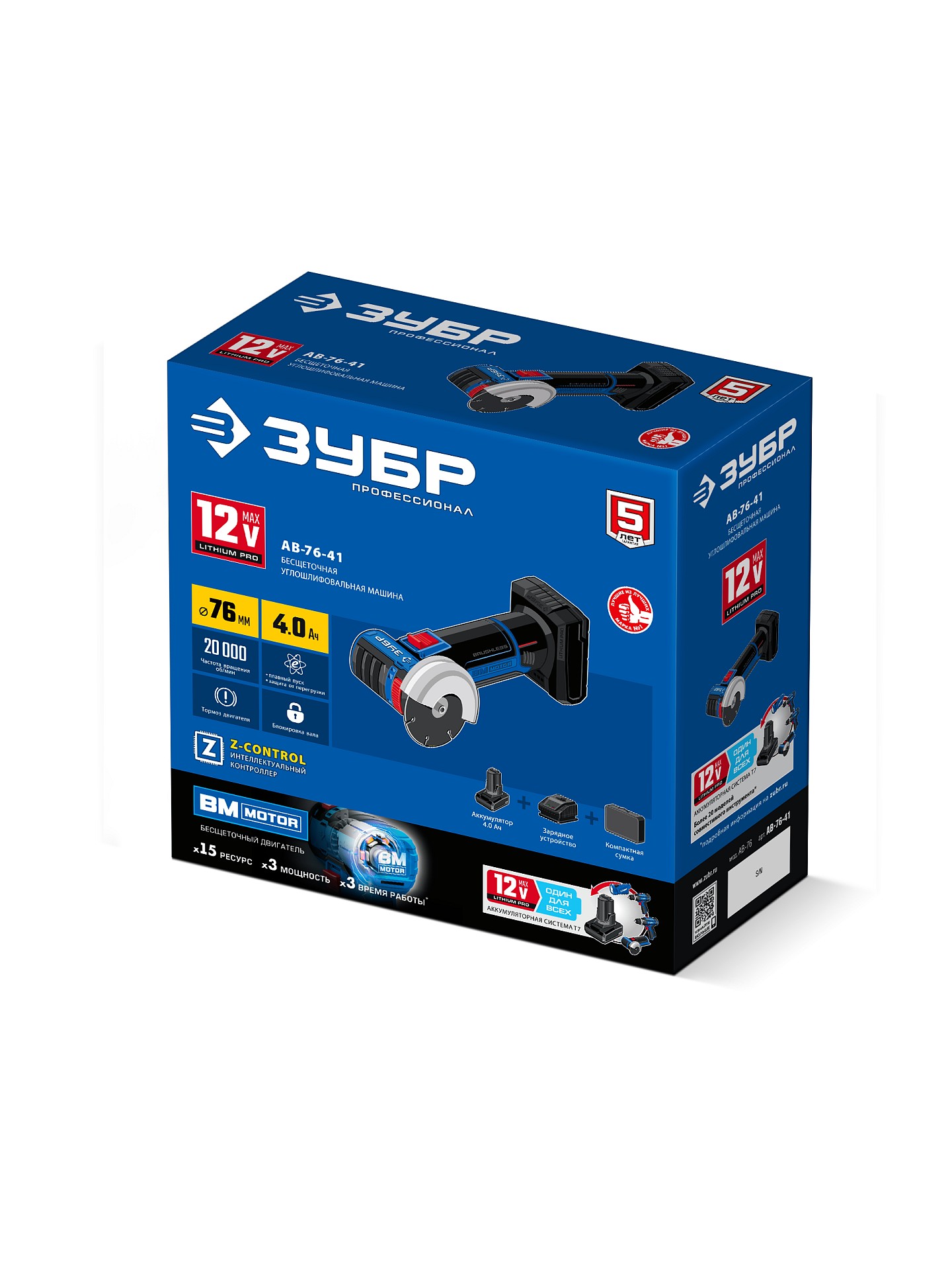 ПроизводителиУгловая мини шлифмашина бесщеточная,12В, D76мм, 1 АКБ тип Т7 4Ач, Профессионал (AB-76-41) ЗУБР