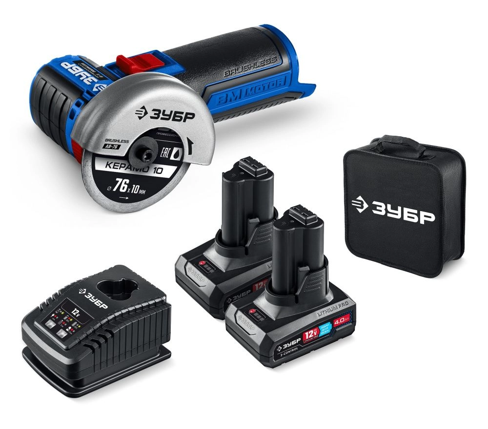 ПроизводителиУгловая мини шлифмашина бесщеточная,12В, D76мм, 2 АКБ тип Т7 4Ач, Профессионал (AB-76-42) ЗУБР