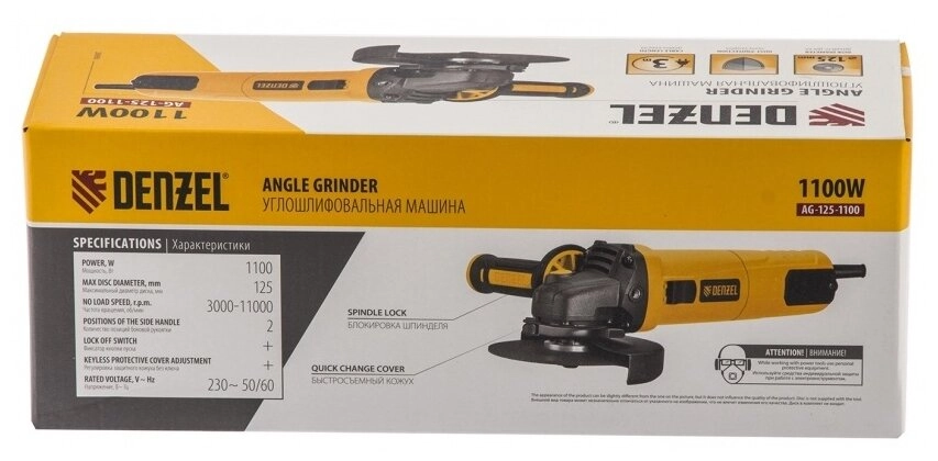 ПроизводителиУгловая шлифмашина AG125-1100, 1100 Вт, 125 мм, 3000-11000 об/мин Denzel