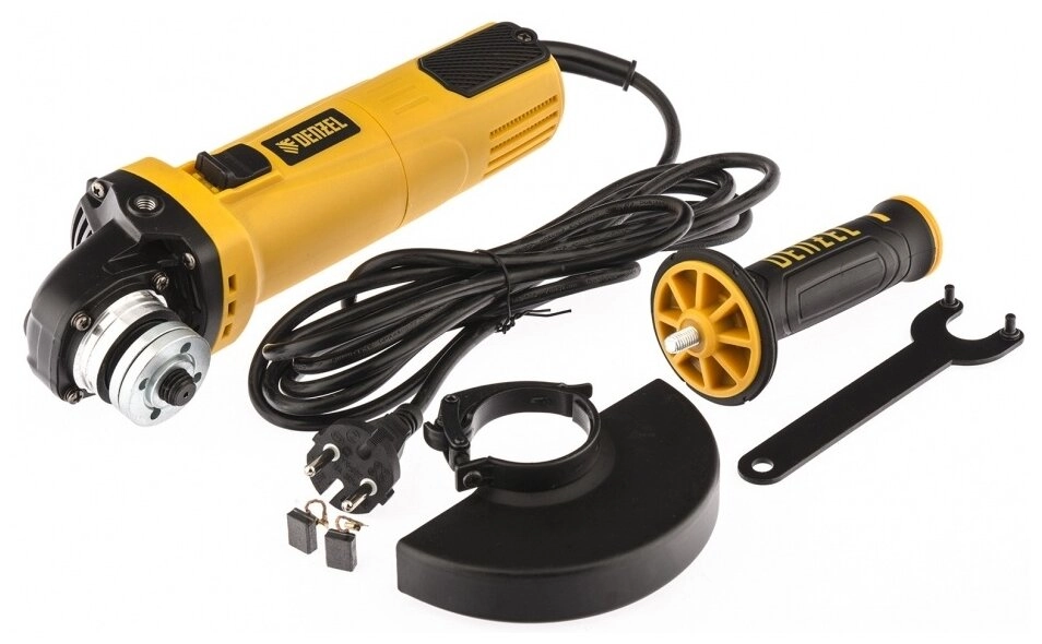 ПРОФИУровень качества. При классификации продуктов, имеющих схожее наименование, но обладающие различными потребительскими свойствами мы приняли следующий Вес факторов: 80% - подтвержденный ресурс, 15% - заявленная производительность/скорость, 5% - субъективные ощущения потребителя. ПодробнееКод товара: 0080847ХарактеристикиАртикул 26906Бренды DENZELСтрана производства КитайСкорость вращения 11000Резьба шпинделя M14Цвет желтый, черныйМатериал корпуса пластикДиаметр диска 125Длина сетевого шнура 3Диаметр посадочного места 22.2Вес 2Питание сетьМощность 1100Регулировка скорости оборотов естьКейс Нет«Константная» электроника естьФиксация шпинделя естьДиаметр посадочного отверстия 22.2Пылеотвод НетБоковая рукоятка ДаБыстрая замена диска НетСинхронизация со смартфоном НетДлина сетевого кабеля 3Остановка при заклинивании ДаТип рукоятки двухпозиционнаяПлавный пуск ДаОписание товара обновлено 28.01.2026 16:52:37Штрихкод (EAN-13): 4044996172231
