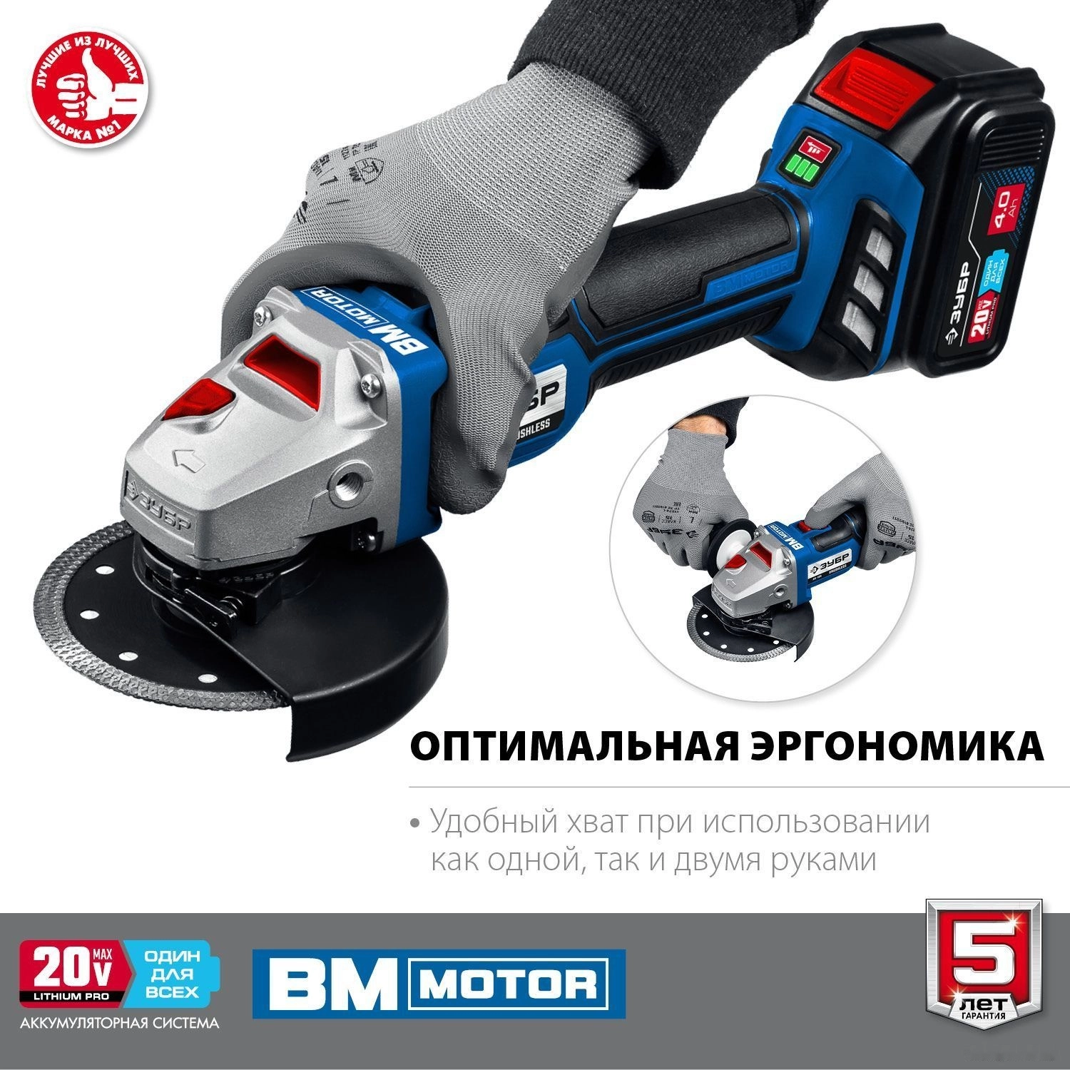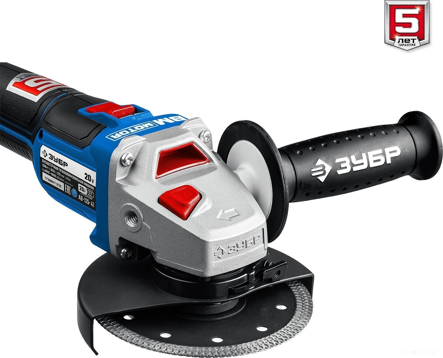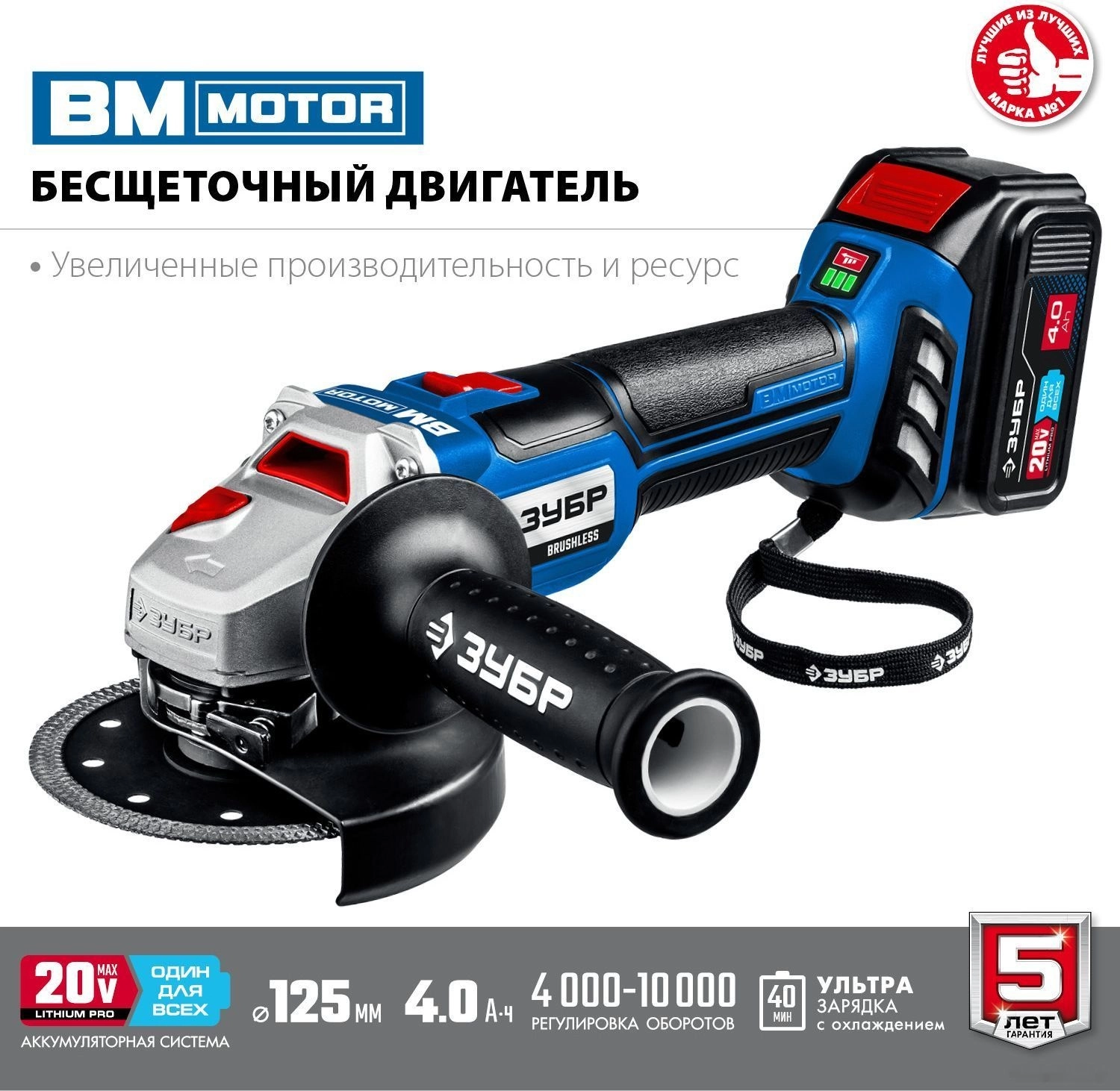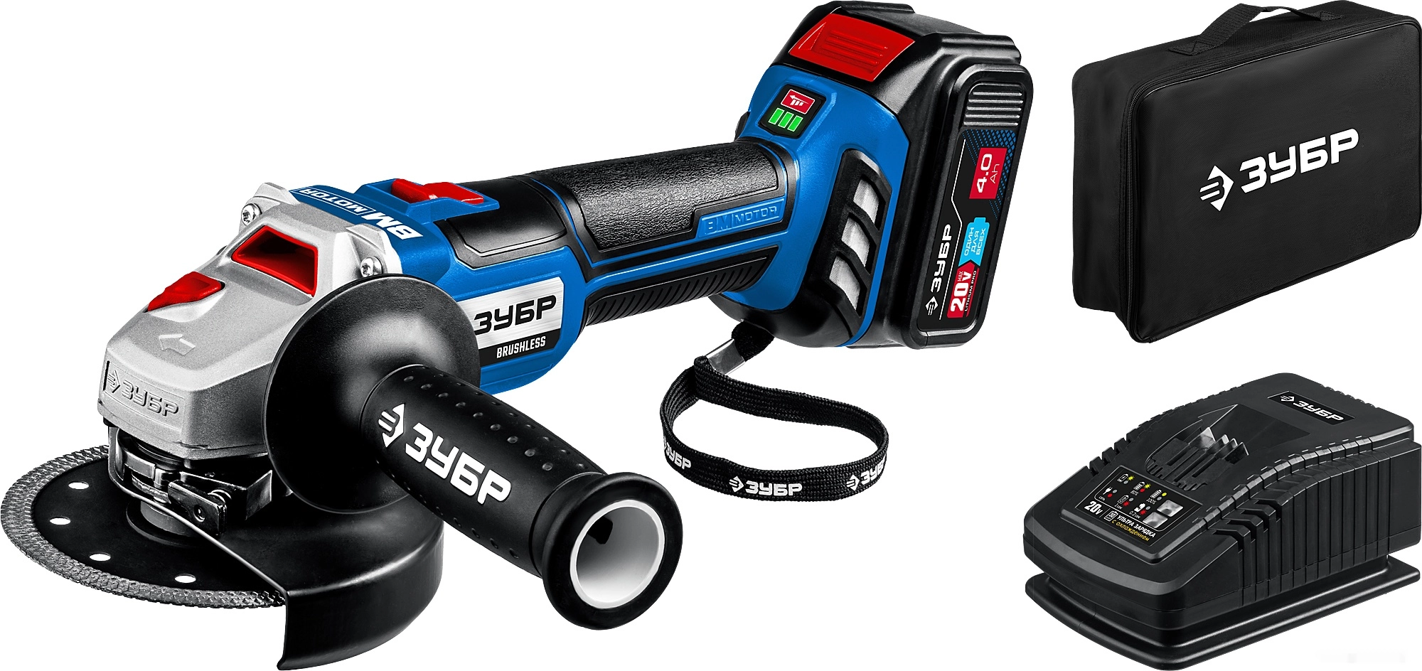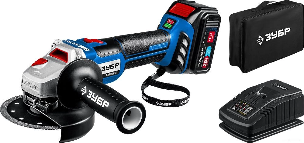 ПроизводителиУгловая шлифмашина аккум. AB-125-41 (20.0 В, 1 акк.х4.0 А/ч Li-Ion,125мм, сумка) "Профессионал" ЗУБР