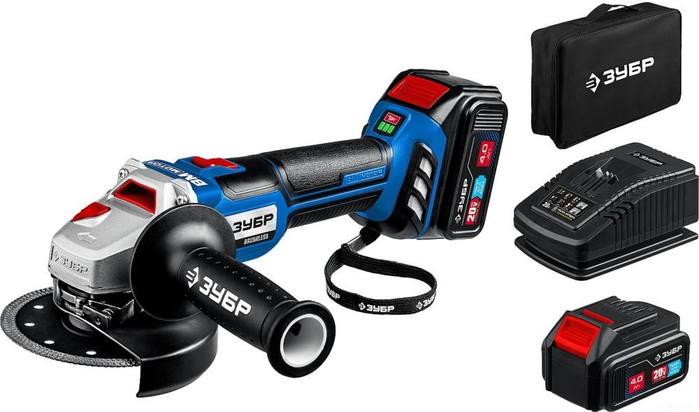 ПроизводителиУгловая шлифмашина аккум. AB-125-42 (20.0 В, 2 акк.х4.0 А/ч Li-Ion,125мм, сумка) "Профессионал" ЗУБР