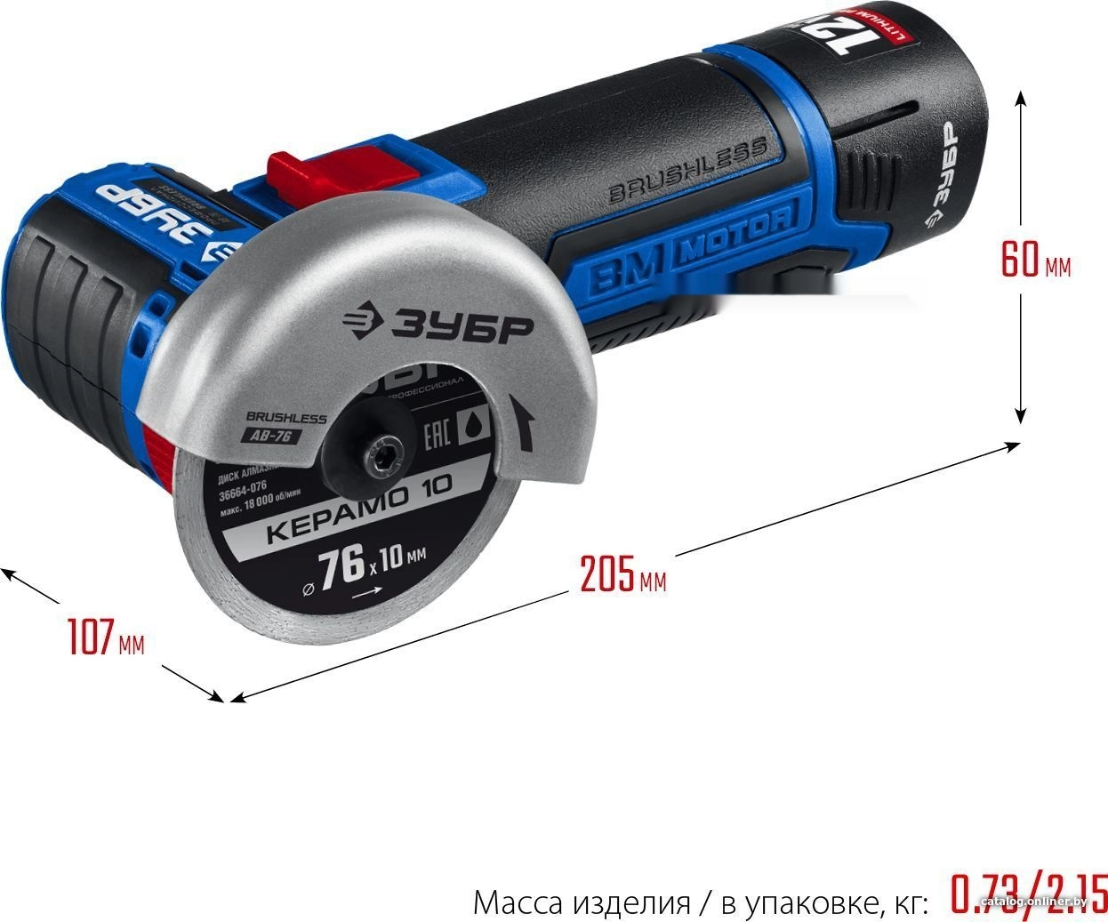 ПроизводителиУгловая шлифмашина аккум. AB-76-22 (12.0 В, 2 акк.х2.0 А/ч Li-Ion, 76мм, кор.) "Профессионал" ЗУБР