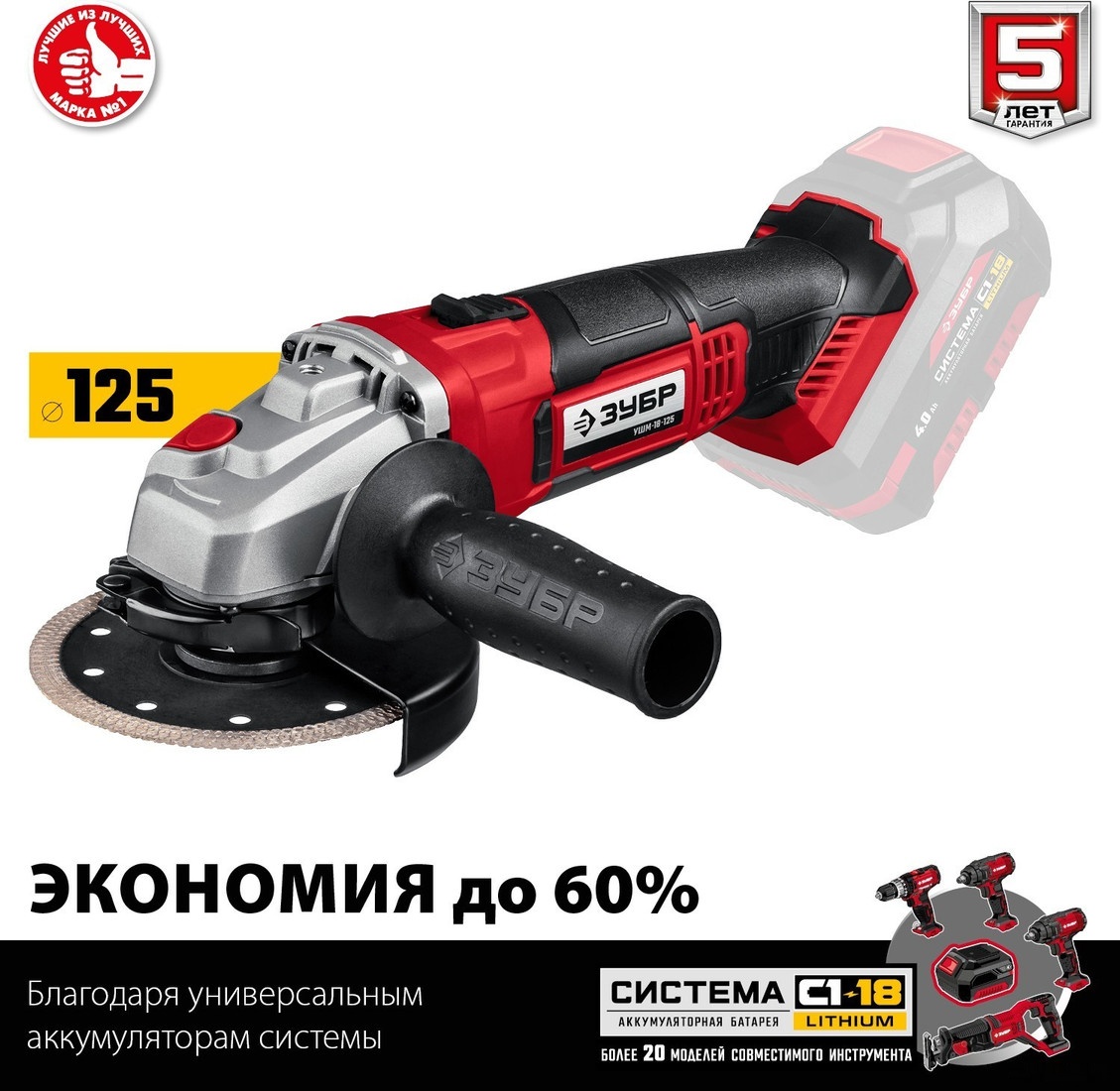 ПроизводителиУгловая шлифмашина аккум. УШМ-18-125 (18.0 В, без АКБ и ЗУ, 125мм, кор.) ЗУБР