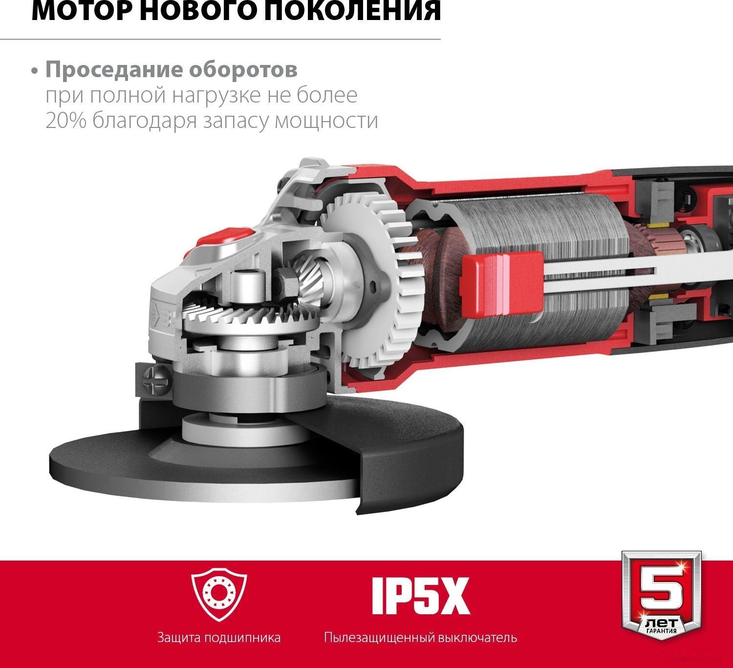 - Пылезащищенный выключатель (степень защиты IP5X) и лабиринтное уплотнение переднего подшипника - надежная защита важных узлов
