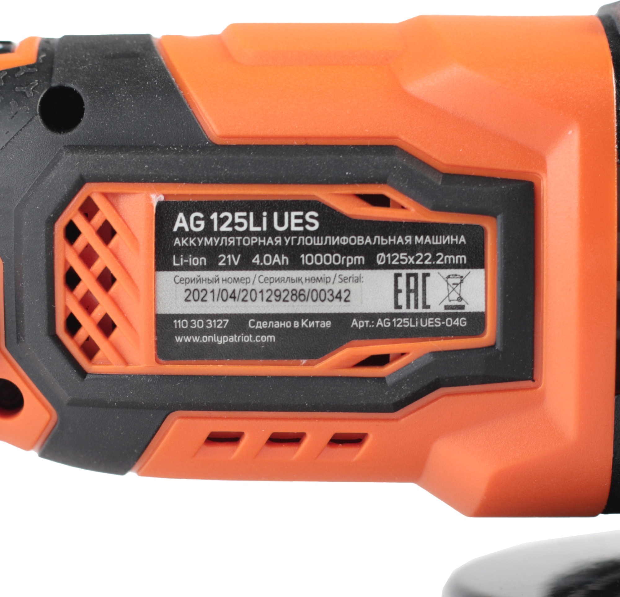 ПроизводителиУгловая шлифмашина аккум. AG 125 Li UES (21.0В, 1 акк.х4.0 А/ч Li-Ion,125мм,чем.) PATRIOT / IMPERIAL