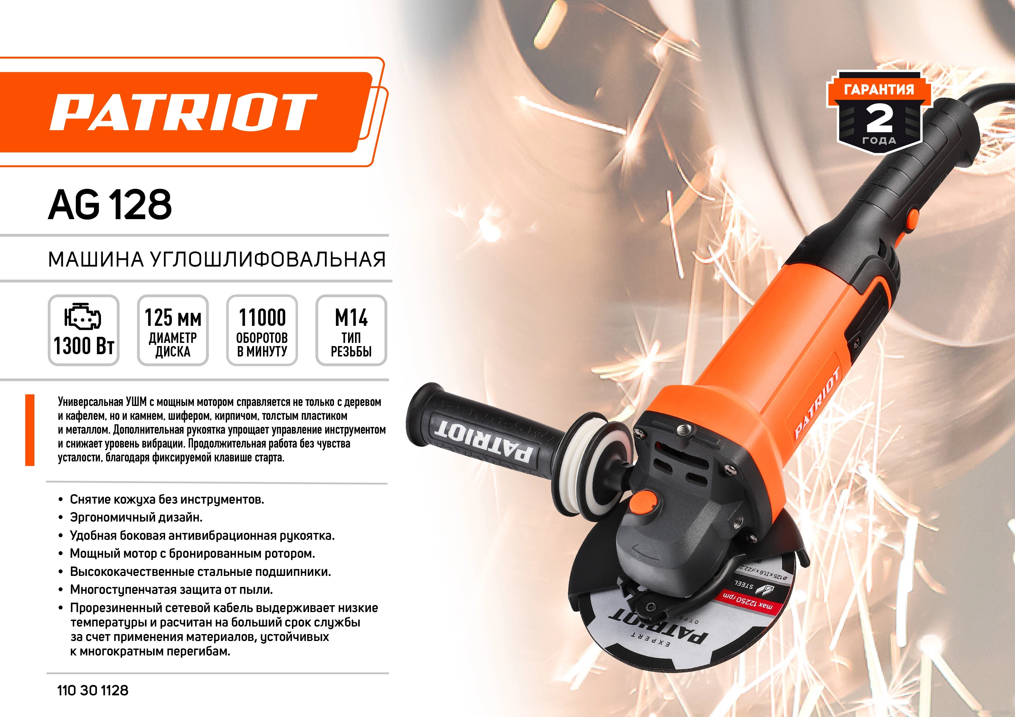 ПРОФИУровень качества. При классификации продуктов, имеющих схожее наименование, но обладающие различными потребительскими свойствами мы приняли следующий Вес факторов: 80% - подтвержденный ресурс, 15% - заявленная производительность/скорость, 5% - субъективные ощущения потребителя. ПодробнееКод товара: 0074655(0)ХарактеристикиАртикул 110301128Бренды PATRIOTСтрана производства КитайГарантия 12 месяцевГабариты (ШхВхГ),мм 110х120х400Потребляемая мощность 1300Уровень звукового давления, дБ(A) 91Число оборотов холостого хода 11000Скорость вращения 11000Резьба шпинделя M14Макс. диаметр диска, мм 125Посадочный диаметр 22,23Рукоятка 3-х позиционнаяДвигатель/Тактность щеточныйДиаметр диска 125Длина сетевого шнура 3Регулировка скорости НетЛегкий пуск НетКейс в комплекте НетБлокировка кнопки включения НетЗащита от перегрузки ЕстьПредохранительная муфта НетПоддержание постоянных оборотов под нагрузкой НетТормоз двигателя НетБыстрозажимная гайка SDS нетПоворот рабочей головки нетВес 2.9Питание сетьМощность 1300Регулировка скорости оборотов нетКейс Нет«Константная» электроника нетФиксация шпинделя естьПылеотвод НетБоковая рукоятка ДаСинхронизация со смартфоном НетДлина сетевого кабеля 3Плавный пуск НетОписание товара обновлено 28.01.2026 16:53:36Универсальная УШМ с мощным моторм справляется не только с деревом и кафелем, но и камнем, шифером, кирпичом, толстым пластиком и металлом. Дополнительная рукоятка упрощает управление инструментом и снижает уровень вибрации. Продолжительная работа без чувства усталости, благодаря фиксируемой клафиши старта.