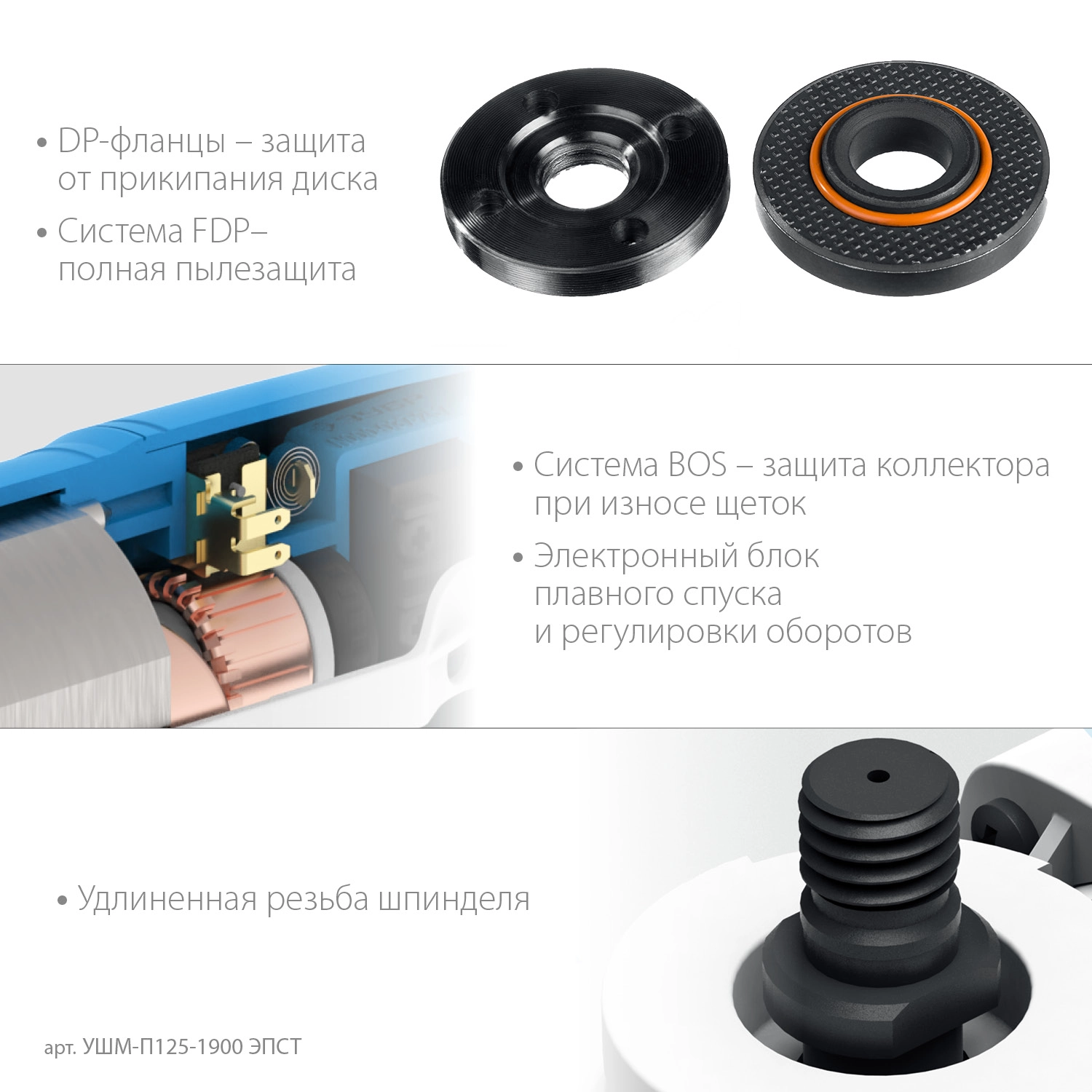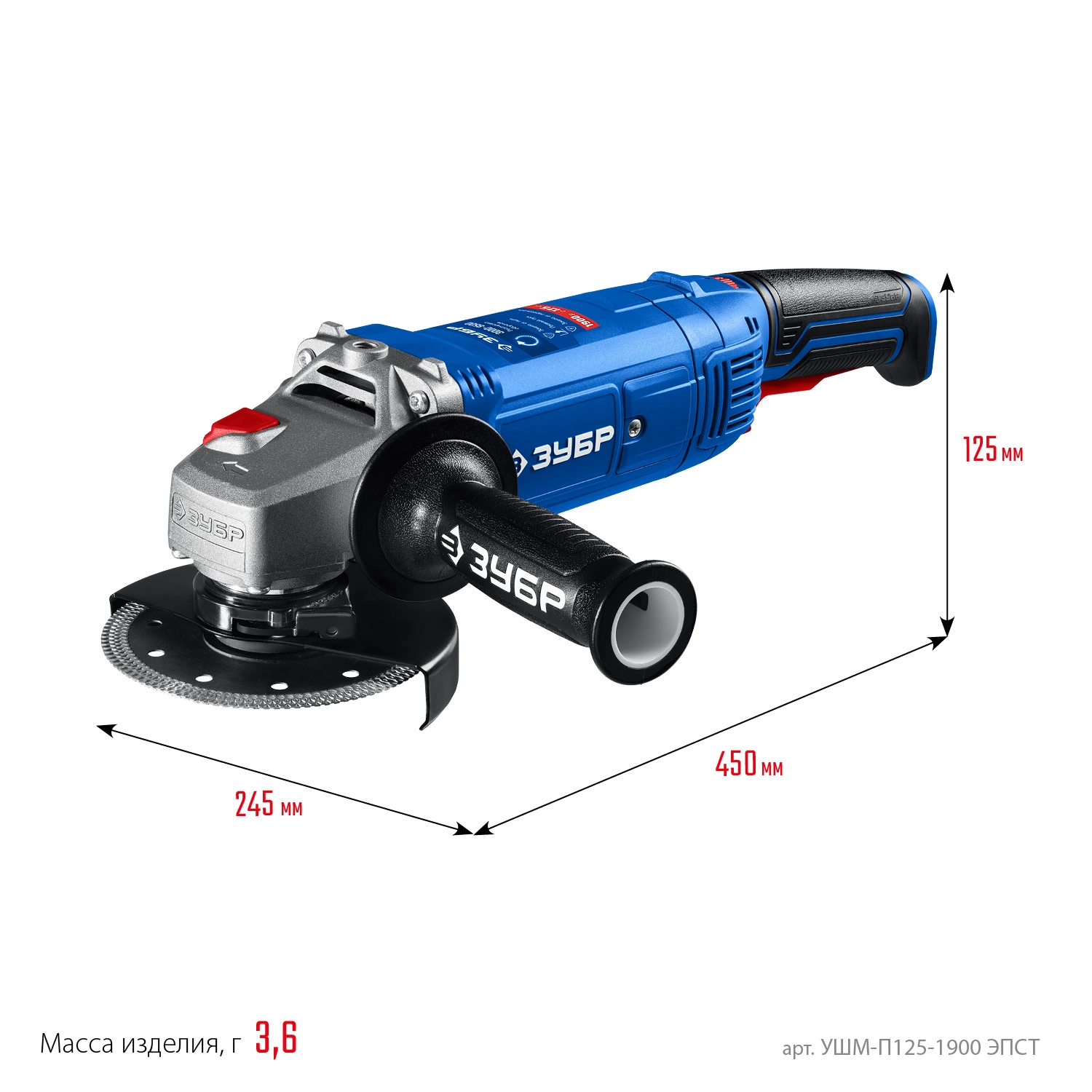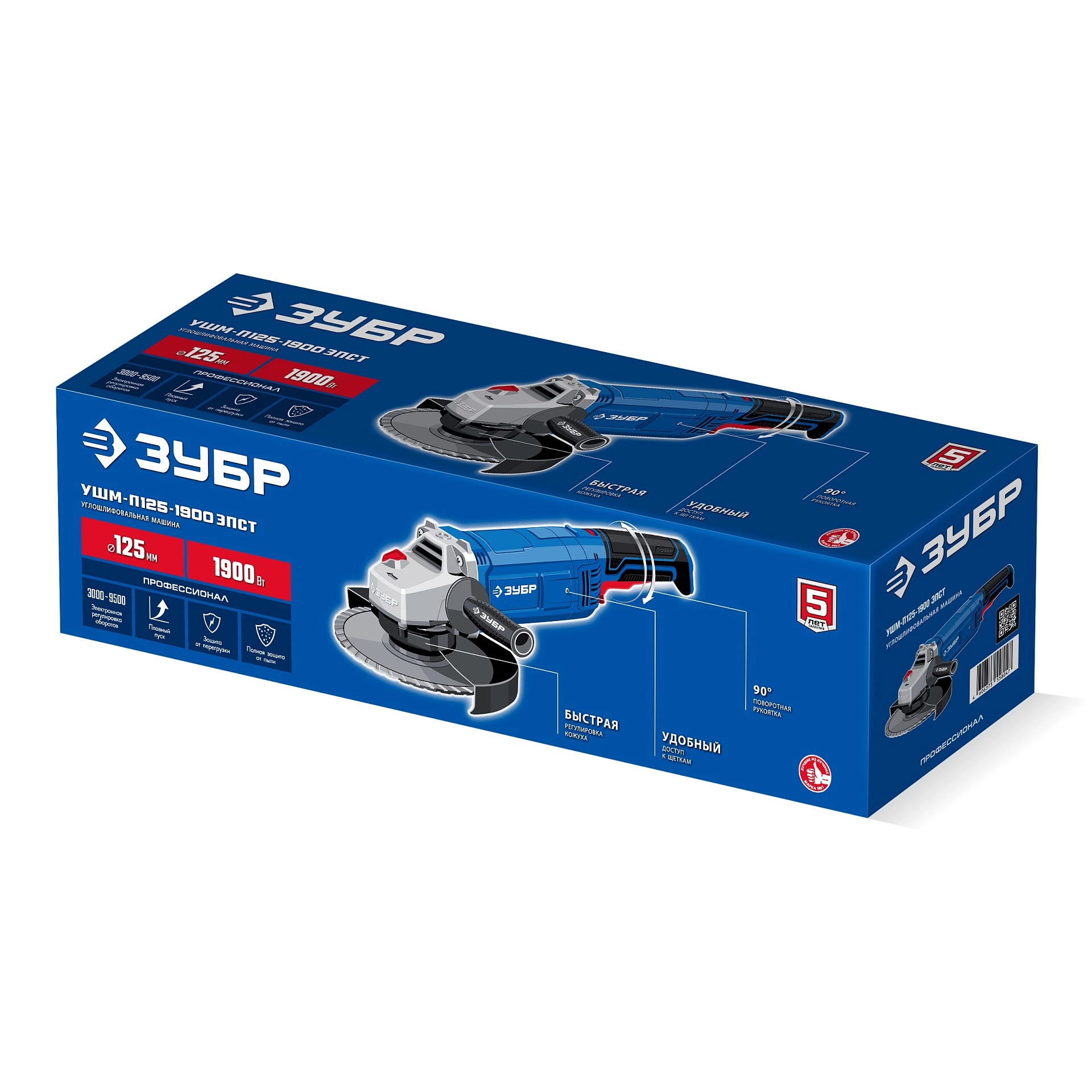 Угловая шлифмашина ЗУБР УШМ-П125-1900 ЭПСТ, предназначена для зачистки, шлифовки и резки металлов, обработки бетона и камня при установке соответствующих шлифовальных, отрезных, алмазных кругов.Производитель: Крафтул И/Е Гмбх, Альтер Поствег Штр., Лоенинген, Германия