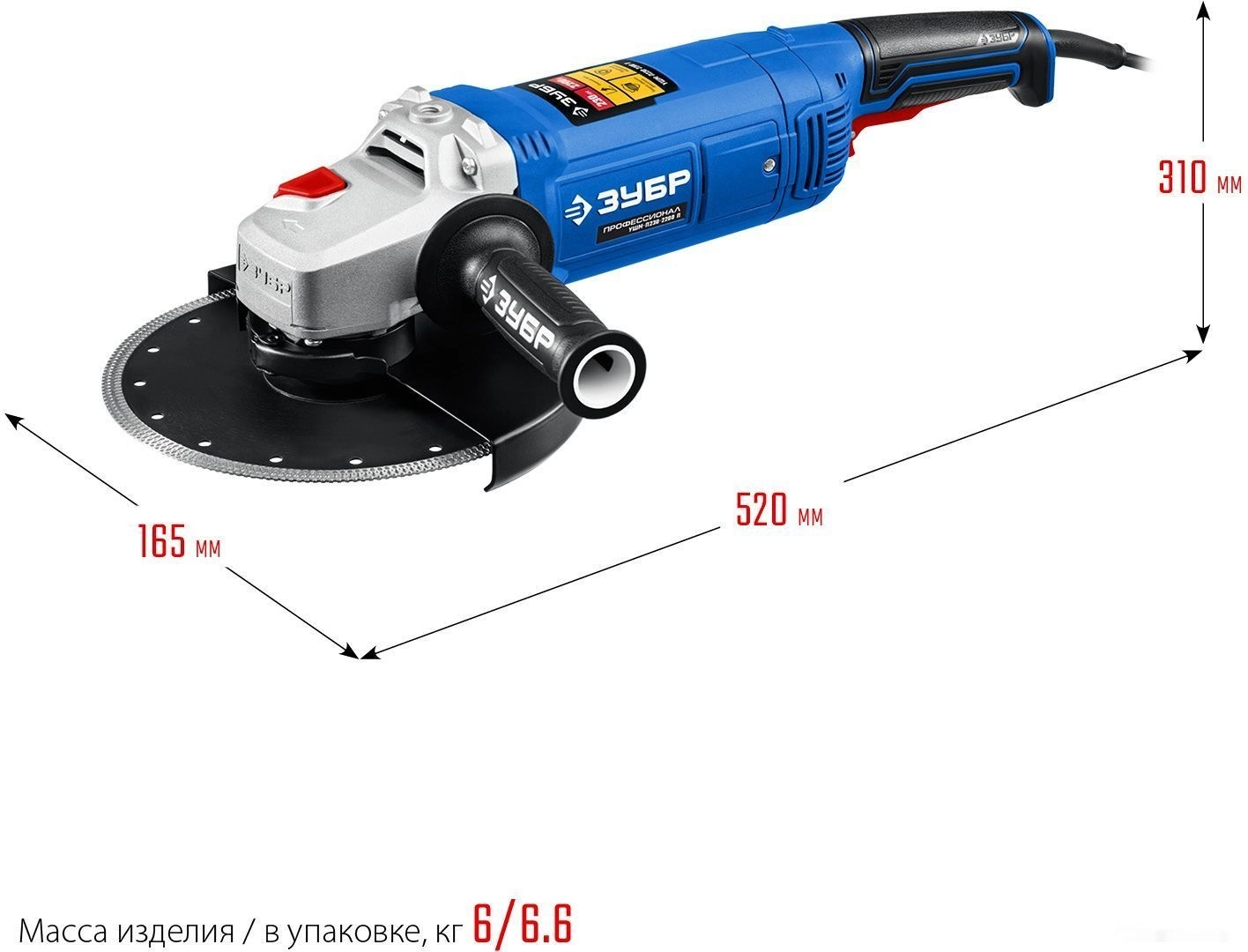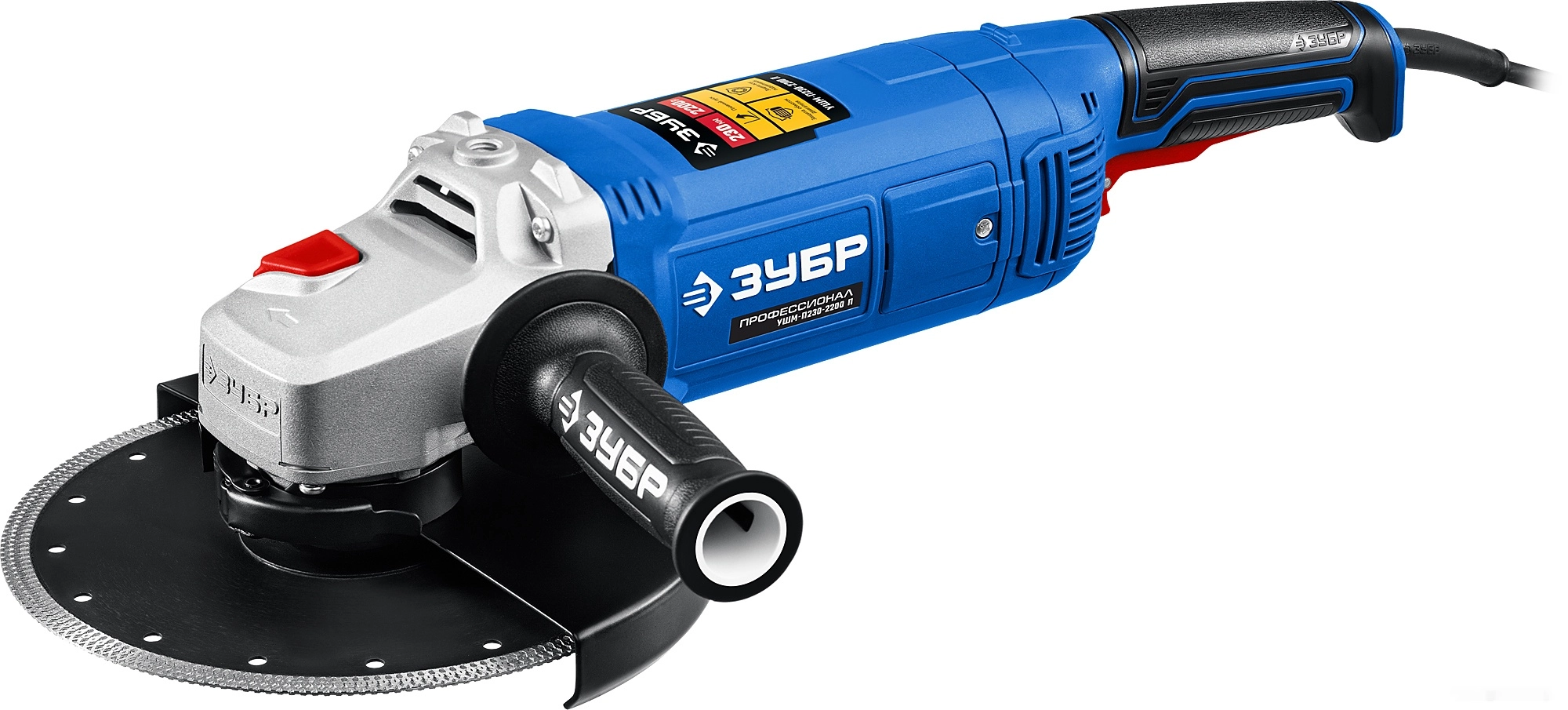 ХарактеристикиАртикул УШМ-П230-2200 ПБренды ЗубрСтрана производства КитайПотребляемая мощность 2200Число оборотов холостого хода 6600Скорость вращения 6600Резьба шпинделя M14Макс. диаметр диска, мм 230Посадочный диаметр 22,23Рукоятка дополнительнаяДиаметр диска 230Длина сетевого шнура 3X-Lock нетРегулировка скорости НетЛегкий пуск ЕстьКейс в комплекте нетБлокировка кнопки включения ЕстьЗащита от перегрузки НетПоддержание постоянных оборотов под нагрузкой НетВес 6Питание сетьМощность 2200Регулировка скорости оборотов нетКейс Нет«Константная» электроника нетФиксация шпинделя естьПылеотвод НетБоковая рукоятка ДаБыстрая замена диска НетСинхронизация со смартфоном НетДлина сетевого кабеля 3Остановка при заклинивании НетПлавный пуск ДаОписание товара обновлено 28.01.2026 16:54:30Угловая шлифмашина ЗУБР УШМ-П230-2200 П, предназначена для зачистки, шлифовки и резки металлов, резки бетона и камня при установке соответствующих шлифовальных, отрезных, алмазных кругов. Отличные характеристики, высокая надежность, усиленная пылезащита и оптимальная эргономика помогают работать максимально эффективно. Система плавного пуска позволяет раскручивать мощный двигатель без рывка и пусковой перегрузки. Поворотная с шагом 90° голова позволяет настроить изделие под левую руку или для резки. Широкий эргономичный выключатель с пылезащитой, блокировкой непреднамеренного включения, а также фиксацией во включенном положении. Быстрый доступ к щеткам для замены. Надежный хват благодаря основной и дополнительной рукояткам с мягкими накладками. Три места крепления дополнительной рукоятки для удобного хвата. Кабель питания с увеличенной длиной 3м в резиновой изоляции.