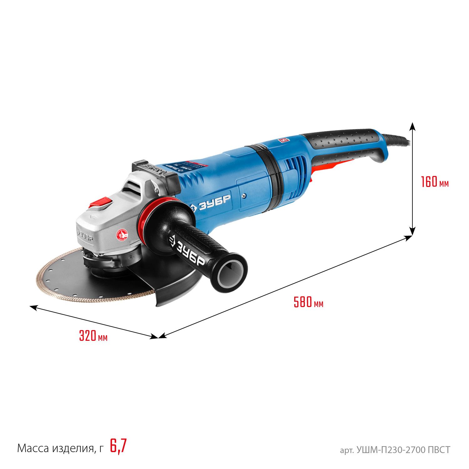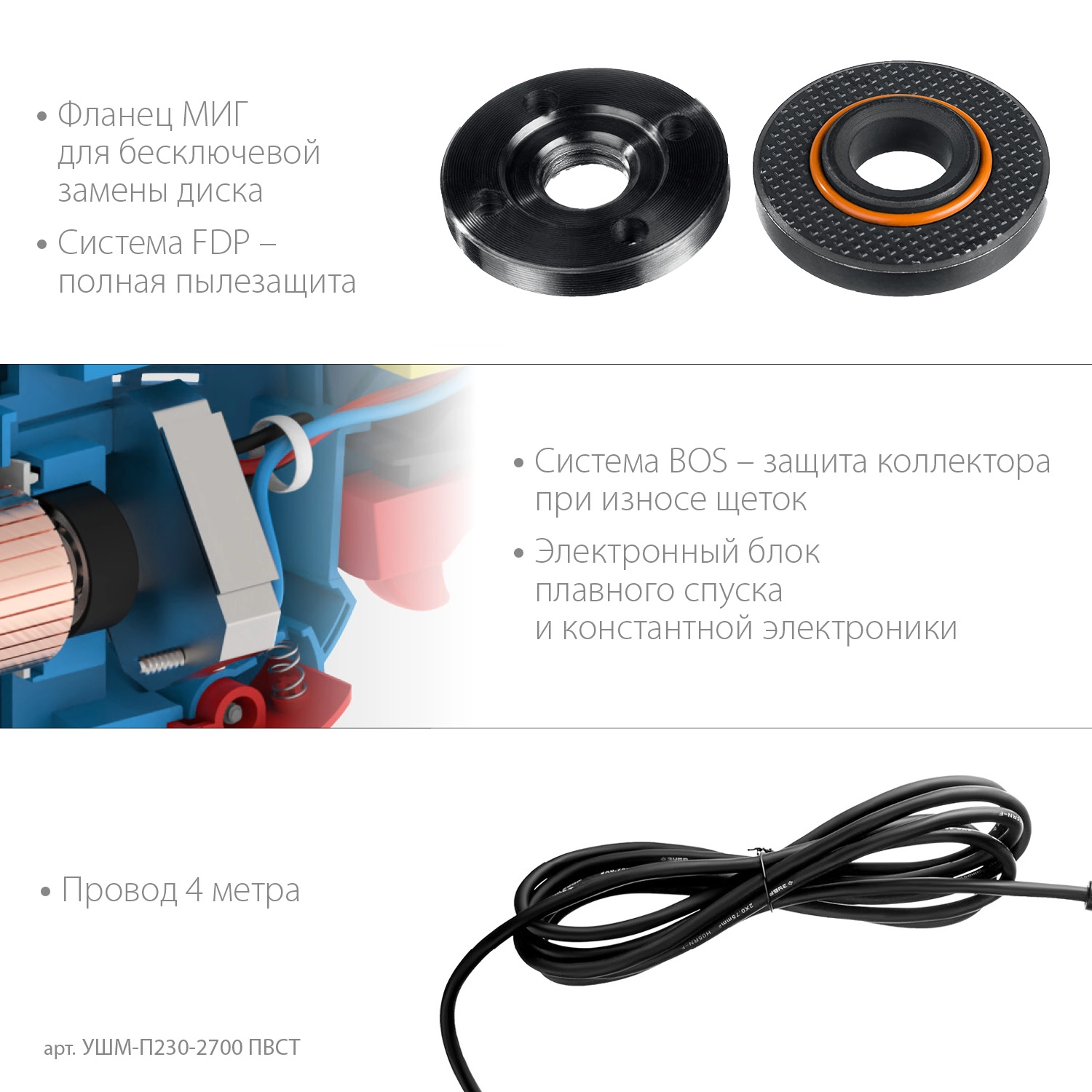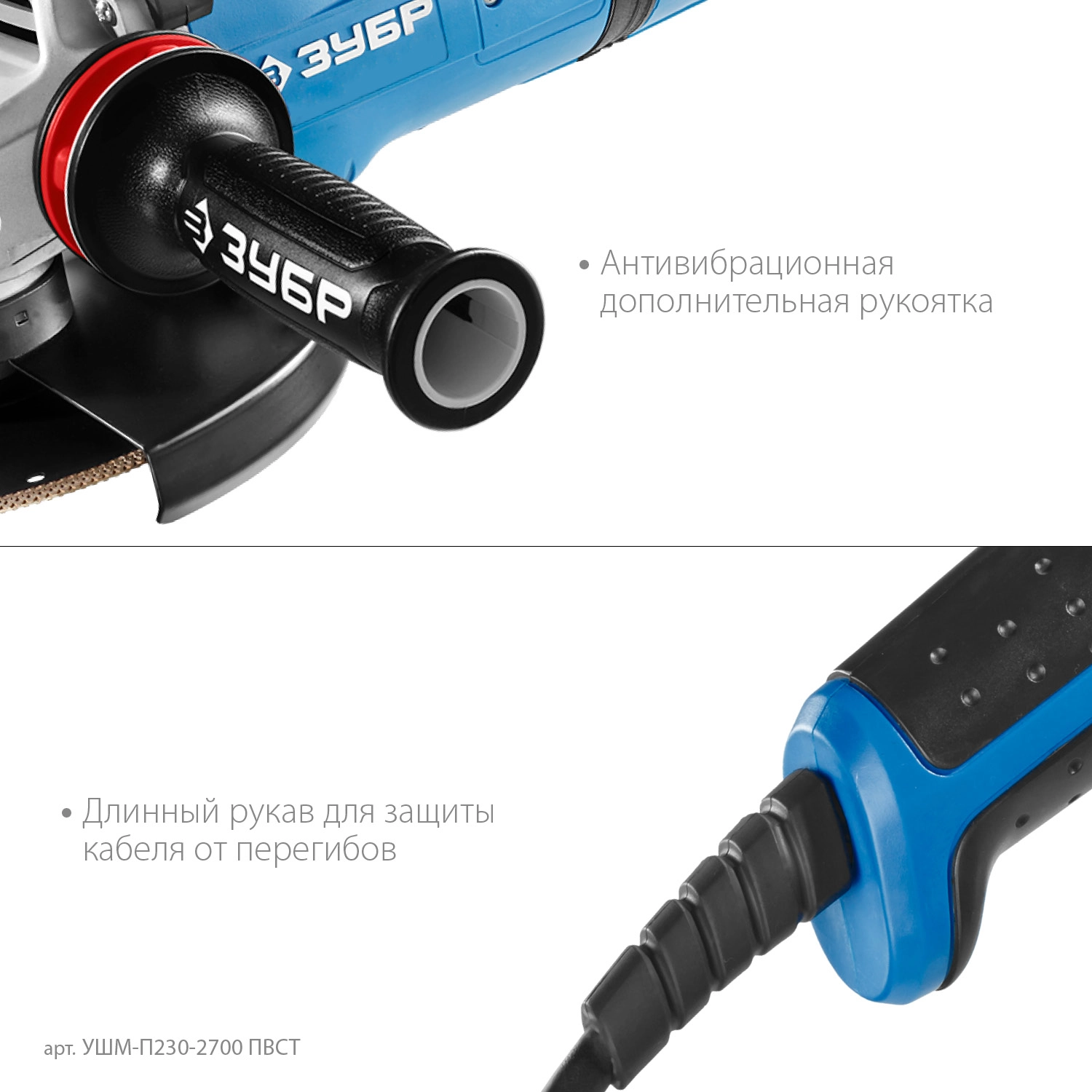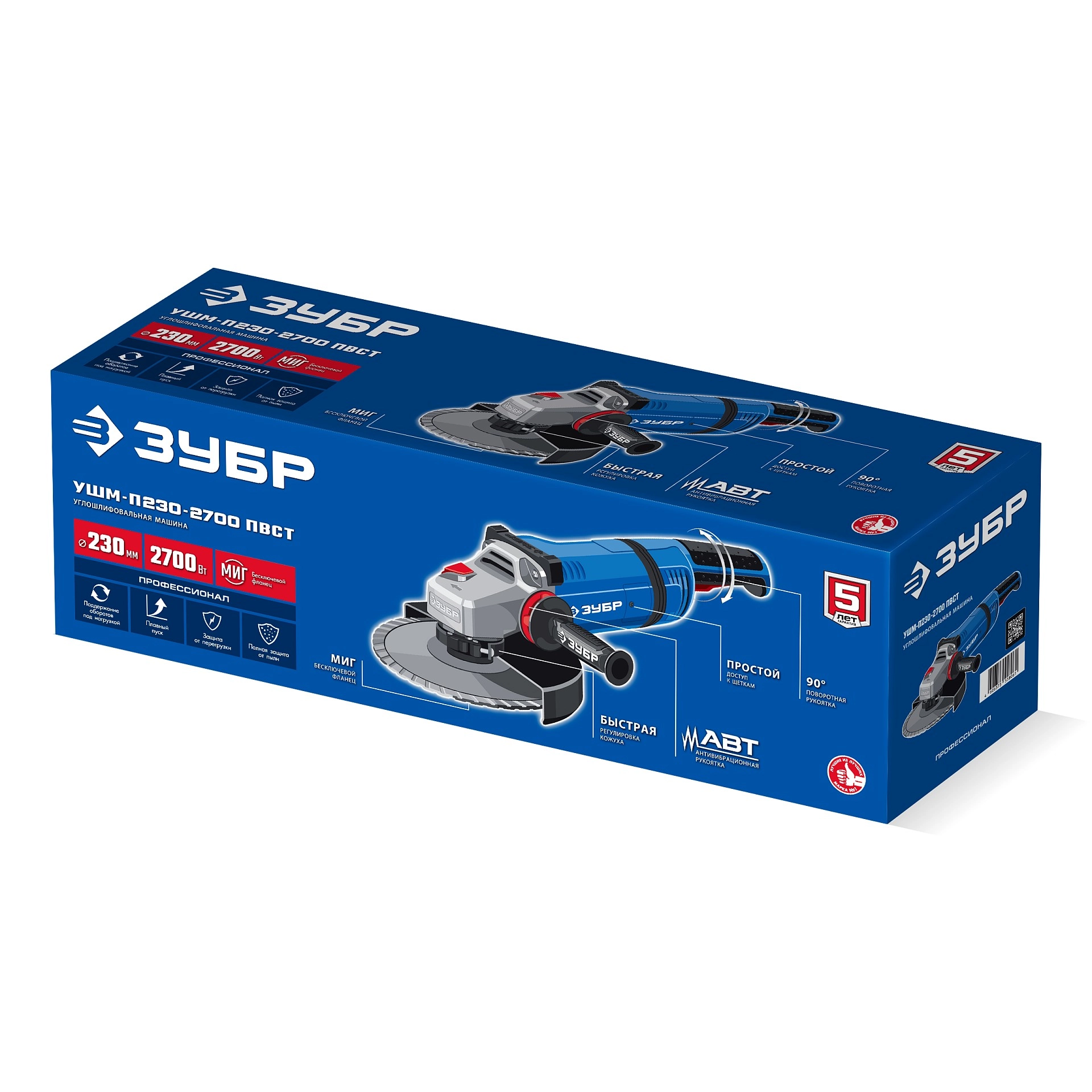 ПроизводителиУгловая шлифмашина УШМ-П230-2700 ПВСТ (2700 Вт, круг 230х22 мм, пл. пуск, кор.) ЗУБР