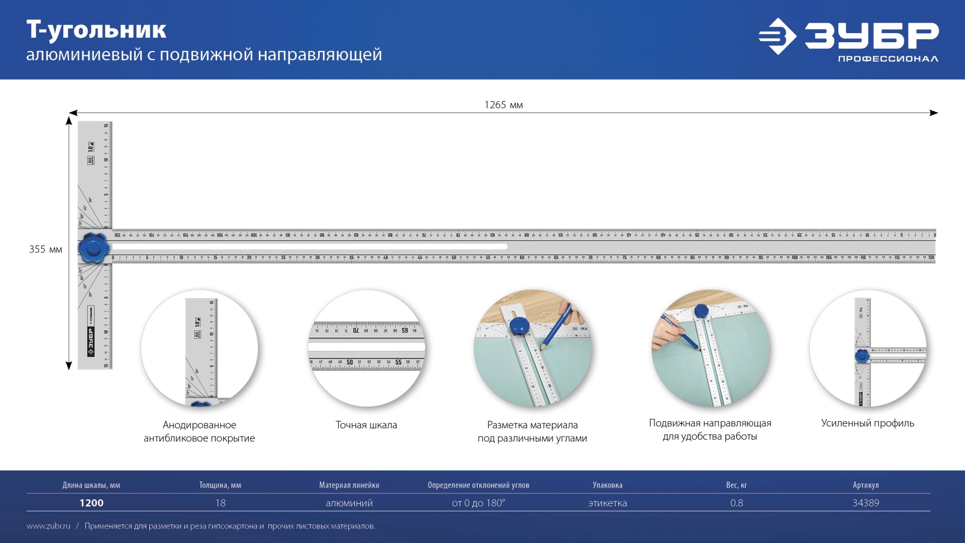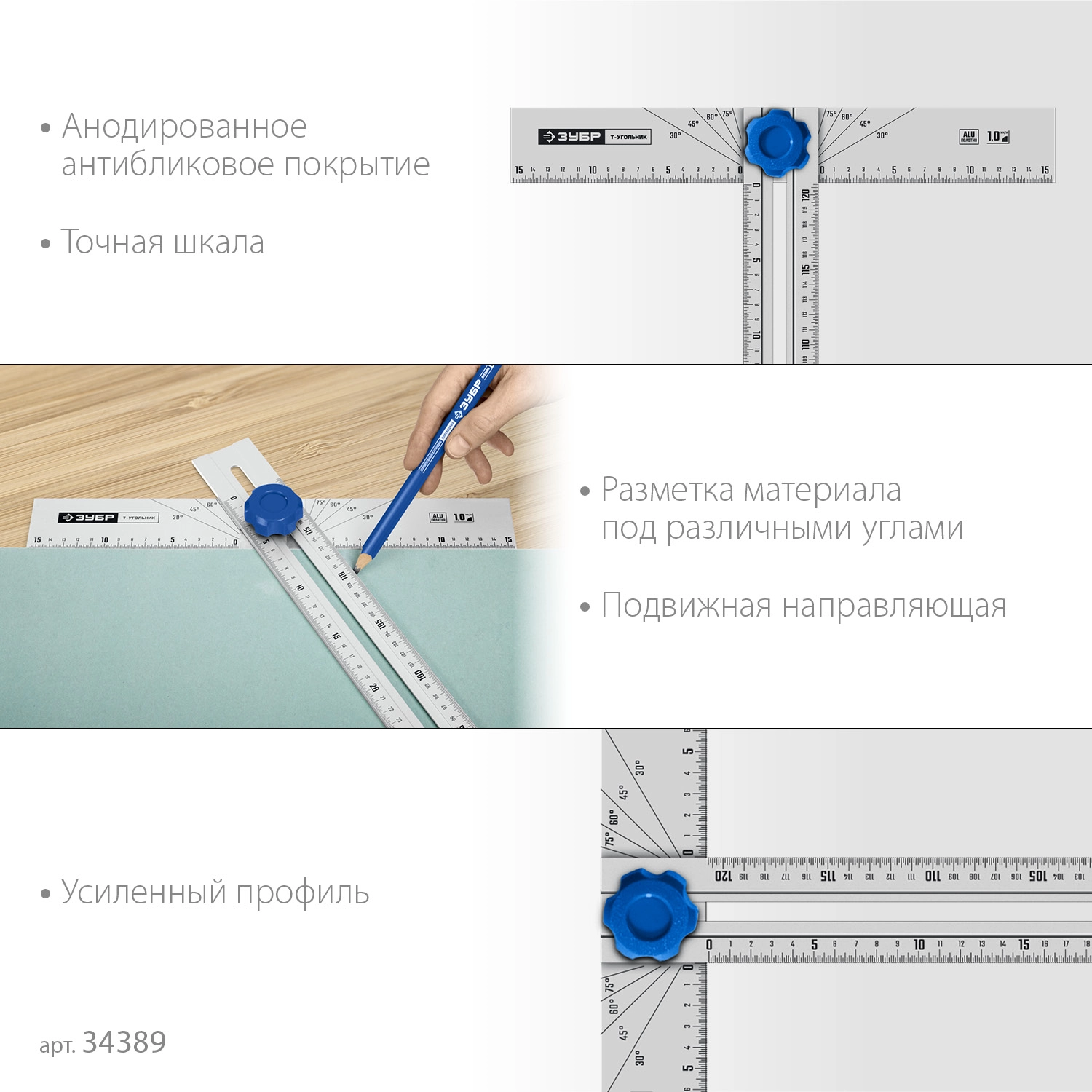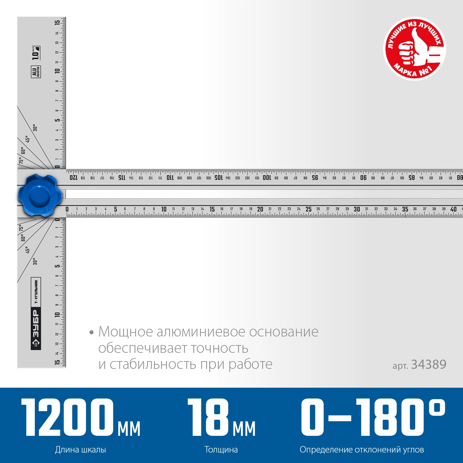 ПроизводителиУгольник алюминиевый Т-образный 1200мм, с подвижной направляющей (34389) ЗУБР