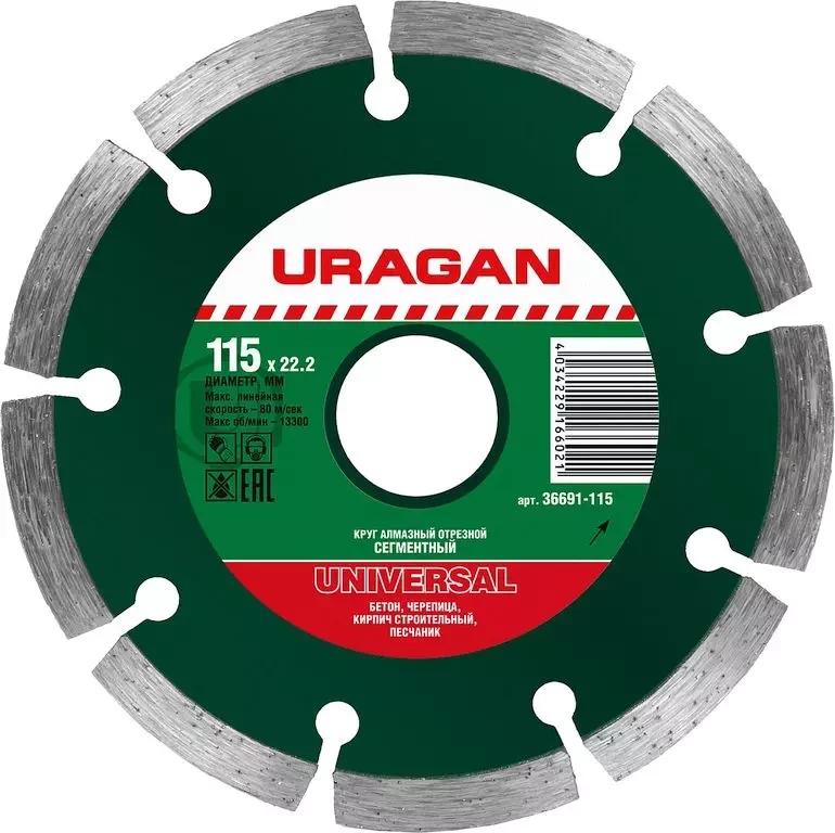 ПроизводителиUNIVERSAL 115 мм, диск алмазный отрезной сегментный по бетону, кирпичу, камню, (36691-115) URAGAN