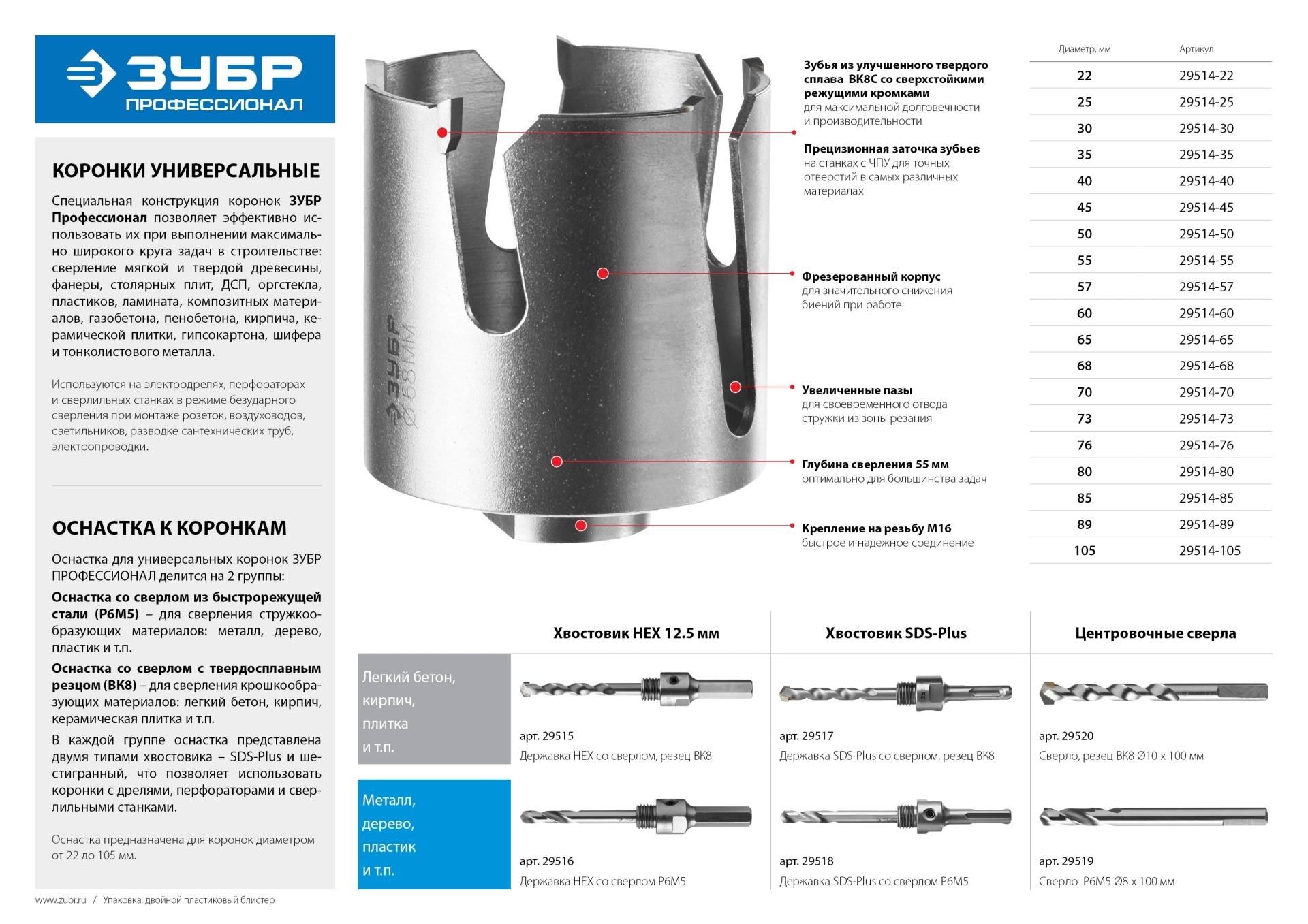 Коронка универсальная 80мм, "ПРОФИ" "ПРОУНИВЕРСАЛ" (29514-80) ЗУБР56.10 руб.Державка для коронок унив. с центр. сверлом, d=22-152мм, SDS-plus, резьба М16 "ПРОФИ" (29517) ЗУБРАртикул: 2951729.28 руб. за 2 шт17.32 руб. за шт32.96 руб. за 2 штЭкономия 135.66 руб.Коронки 0Похожие товарыКод товара: 0021756Благодаря применению высококачественных материалов и современных методов изготовления обеспечивается высокий ресурс работы и максимальная производительность. Применяется при сверлении металла, дерева, ДСП, гипсокартона и твёрдых пластмасс.46.87 руб. Скидка 1% 46.18 руб. за штКод товара: 0052886251.16 руб. Скидка 7% 233.58 руб. за штКод товара: 00689146.37 руб. за штКод товара: 00086195.62 руб. за шт - Оснастка к электроинструментам