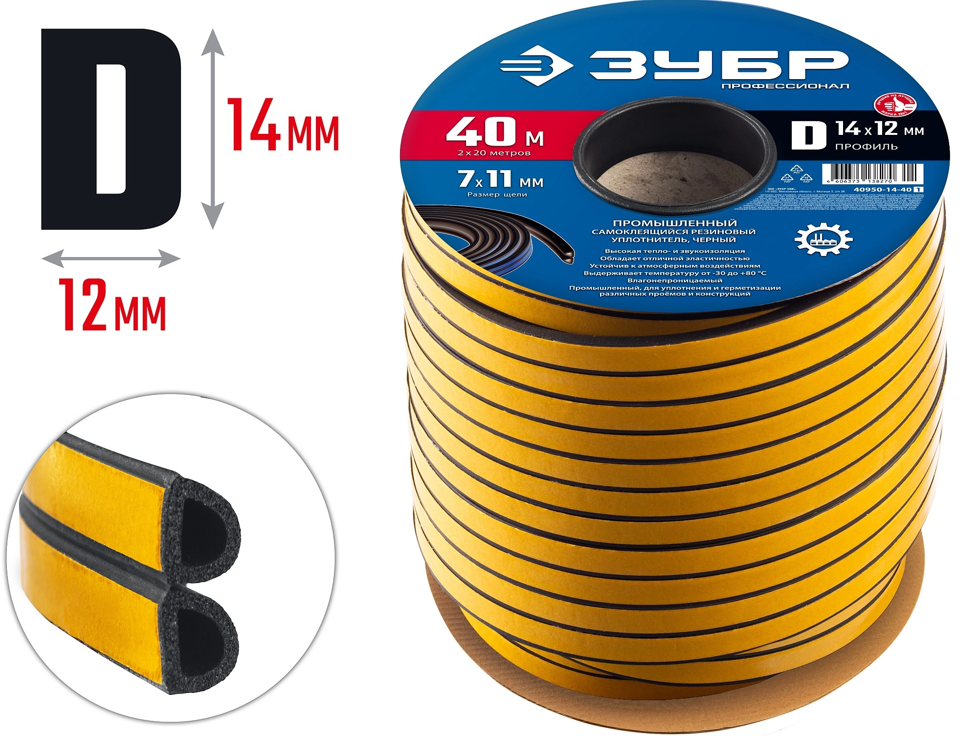 ПроизводителиУплотнитель промышленный, самоклеящийся, черный, профиль "D", 14ммх12мм, 40м (40950-14-40_z01) ЗУБР
