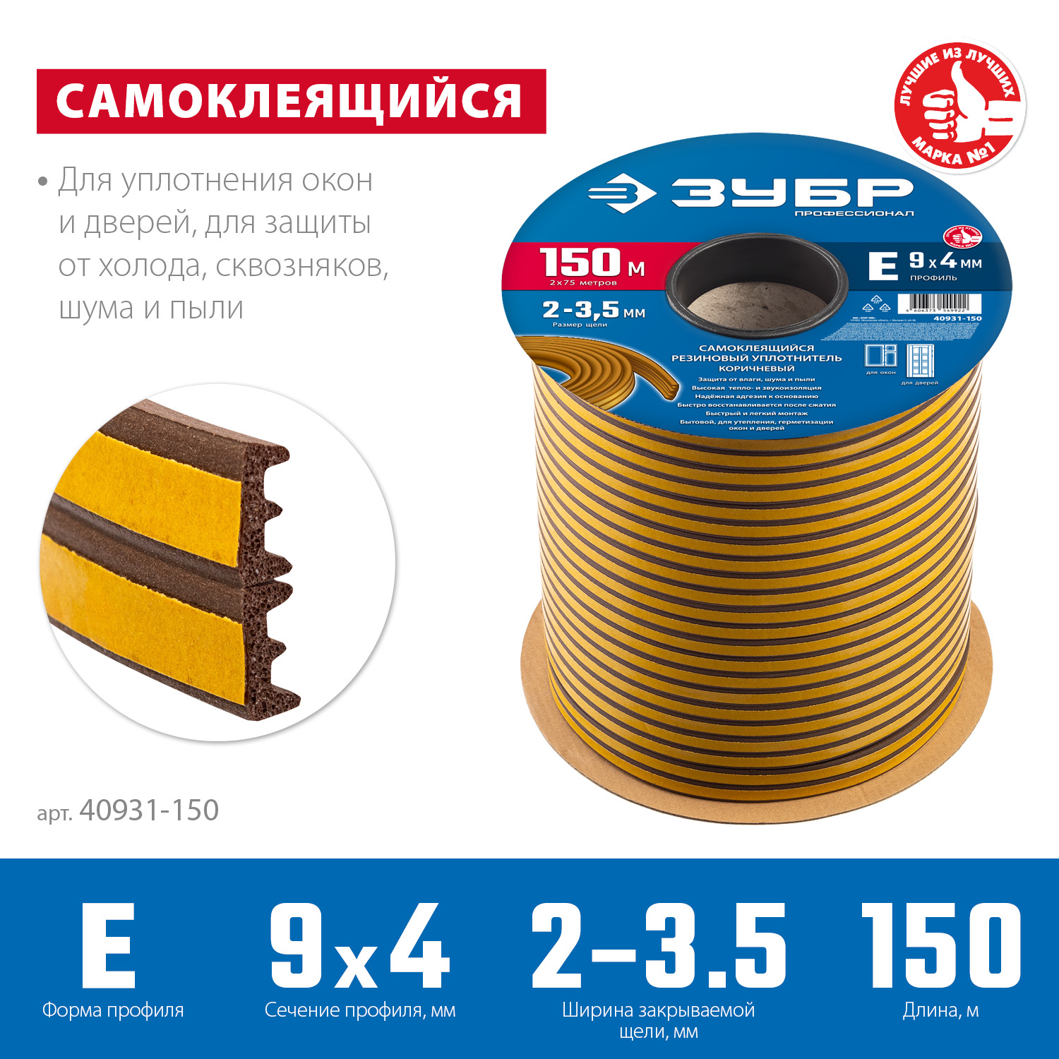 ПроизводителиУплотнитель самоклеящийся резиновый коричневый 150м, Е-профиль, 9х4мм (40931-150) ЗУБР