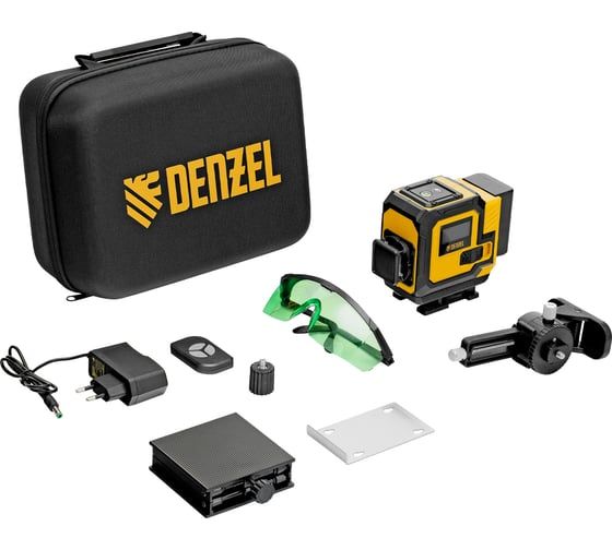 Мультипризменный лазерный уровень Denzel DLV-360-3C 35080 поставляется в кейсе, работает от аккумулятора Li-Ion емкостью 2,4 А·ч и проецирует горизонтальную и 2 вертикальные линии на расстояние до 30 м при помощи зеленых лучей длиной 520 нм.
