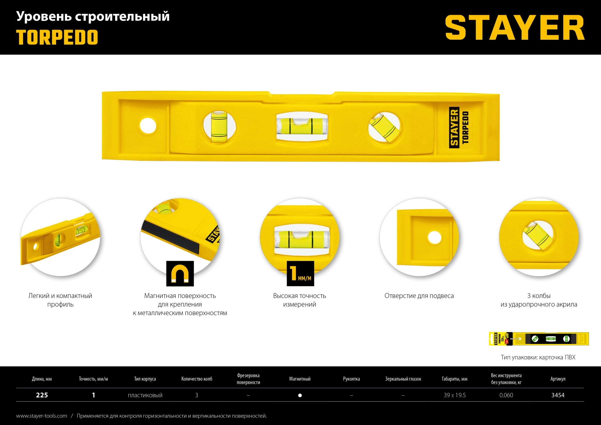 ПроизводителиУровень магнитный 225мм "Torpedo" (3454_z02) STAYER