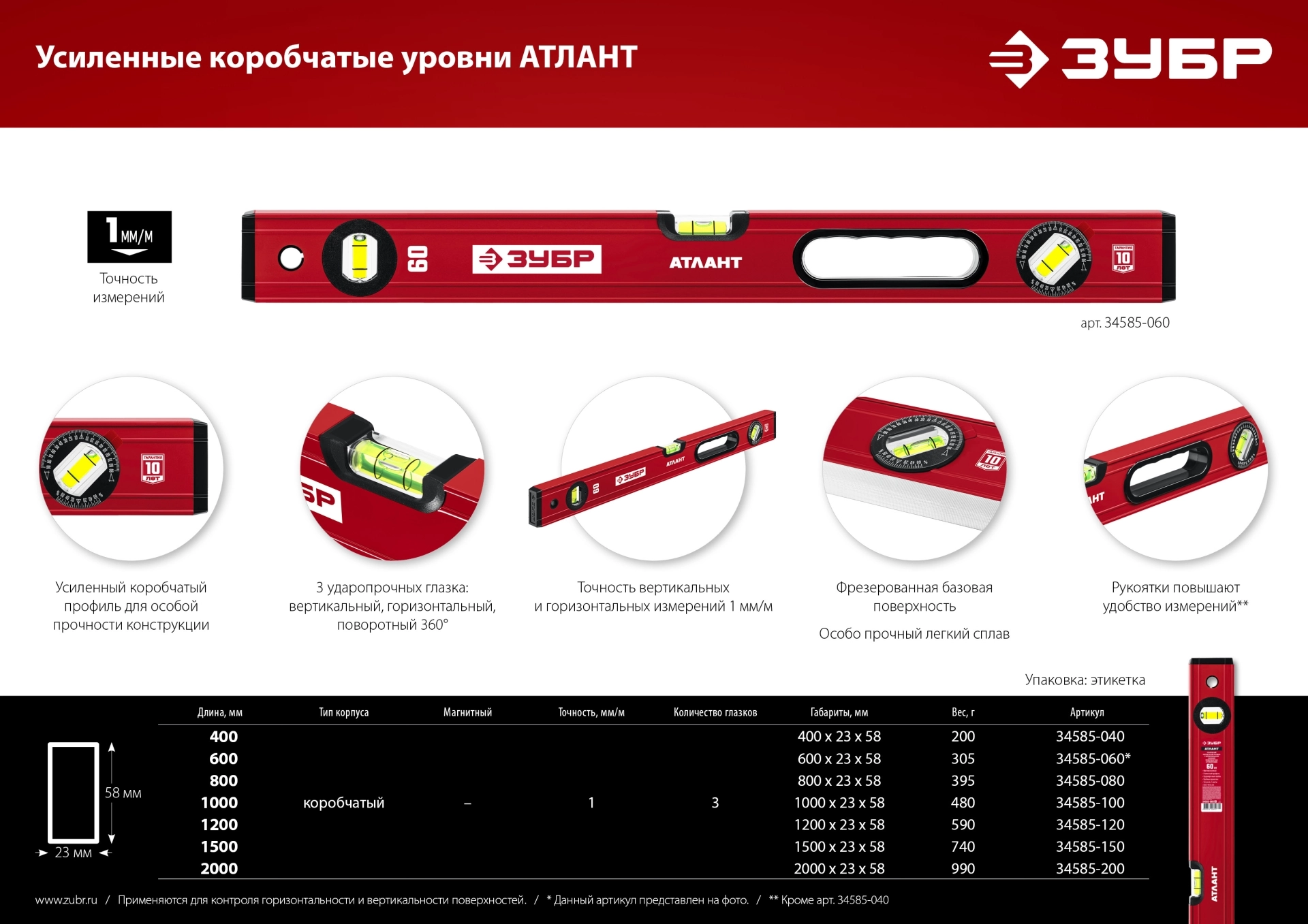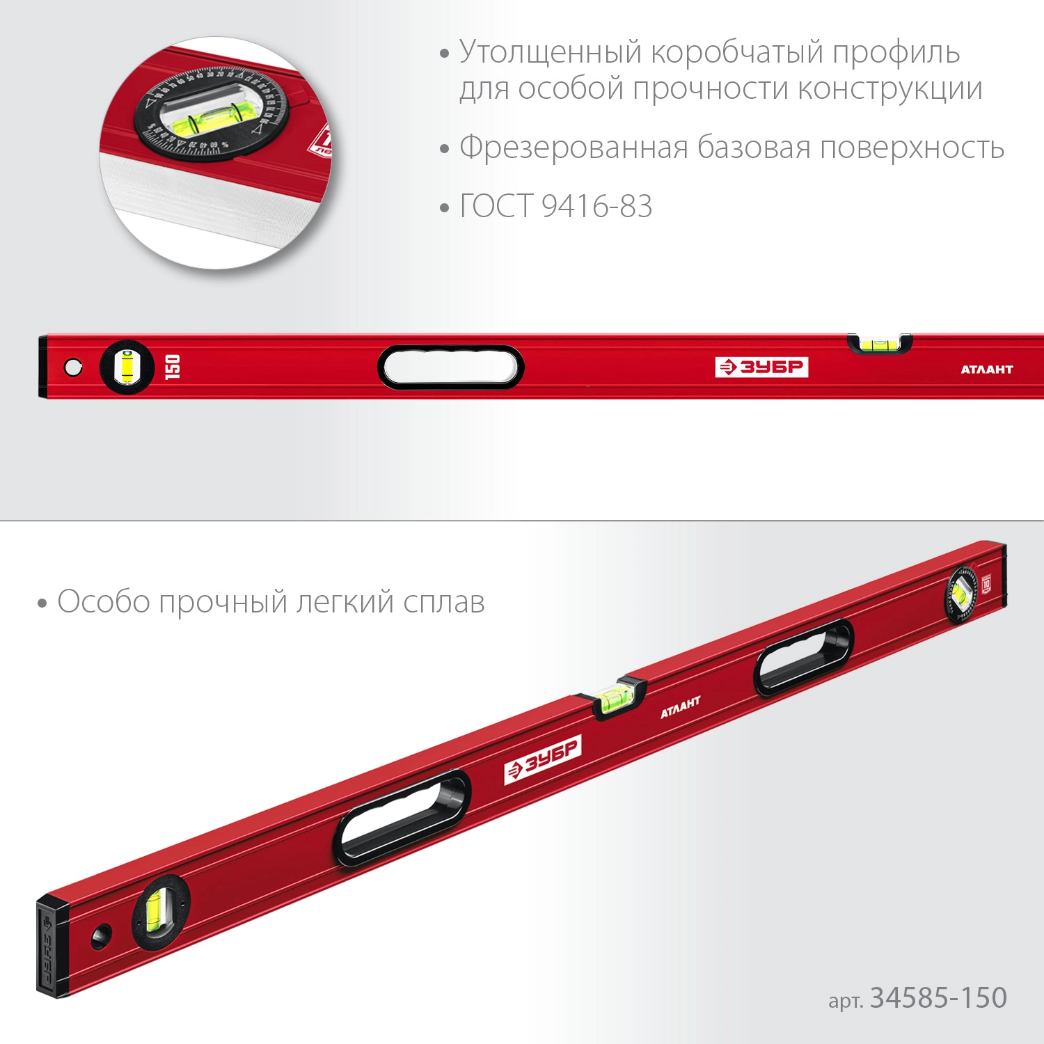 ХарактеристикиАртикул 34585-150_z01Бренды ЗубрСтрана производства КитайДлина, см 150Количество глазков (колб) 3Точность измерения, мм/м 0,5Магнит НетШкала НетВес 1.1Усиленный коробчатый уровень с фрезерованной базовой поверхностью и рукоятками