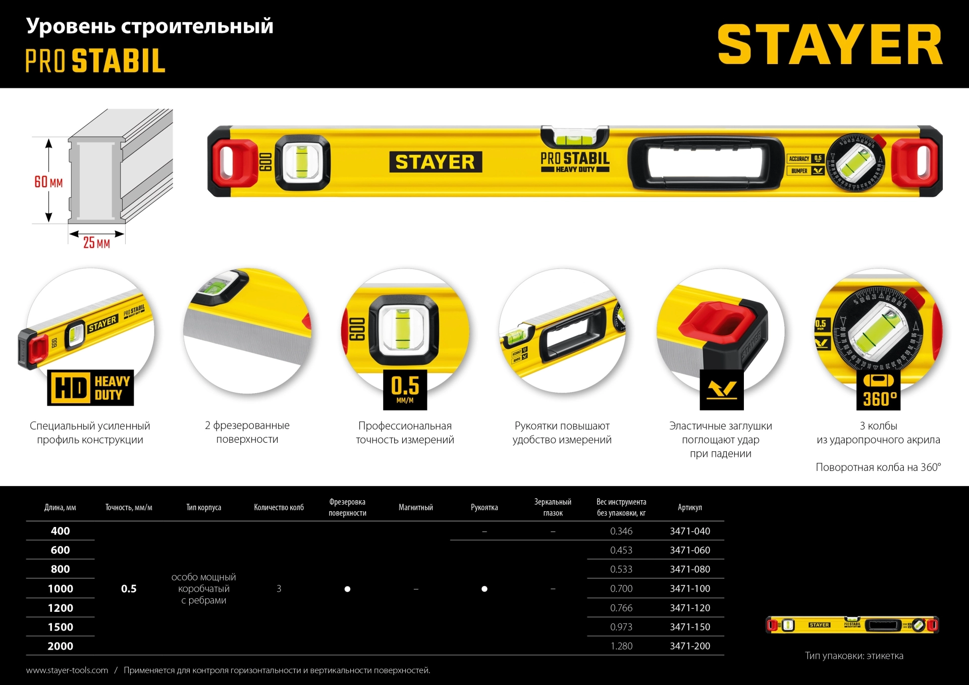 ПроизводителиУровень строительный, 200 см. (0.5 мм/м, 3 гл., фрезер.), быт. "PROStabil" (3471-200_z02) STAYER