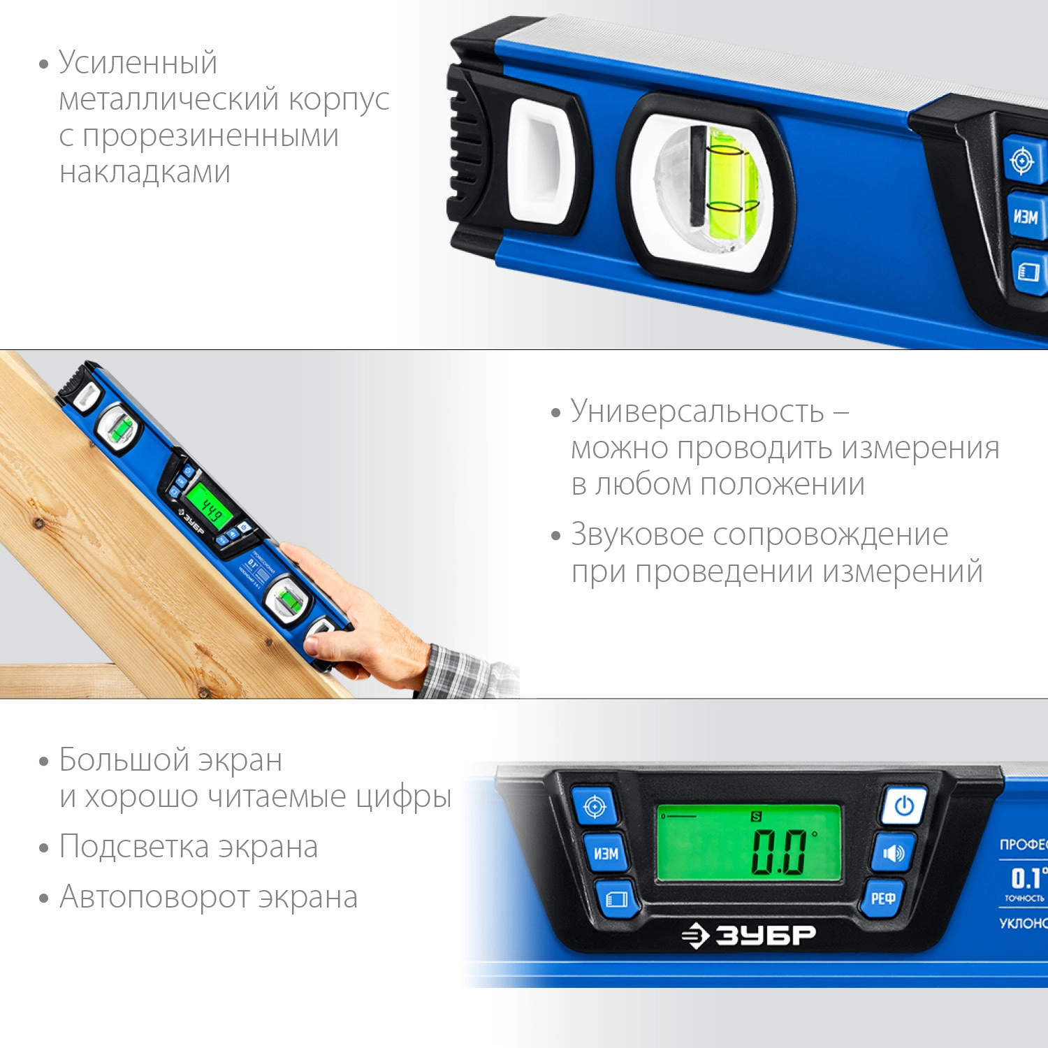 ПроизводителиУровень-уклономер, 400мм, диапазон 0-90°, ±0,2°, Подсветка экрана "Горизонт" (34286) ЗУБР