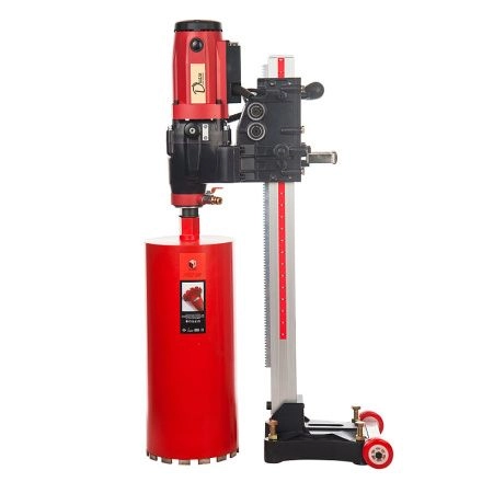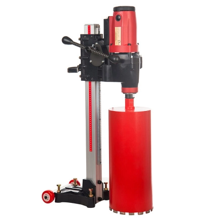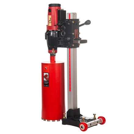 Подходит для выполнения большого объема работ по сверлению отверстий в железобетоне, блоках, кирпиче. Максимальный рекомендуемый диаметр сверления по железобетону до 200 мм, по кирпичу 254 мм. Машина снабжена механической фрикционной муфтой, которая защищает электродвигатель от резкой нагрузки (заклинивания коронки в бетоне).