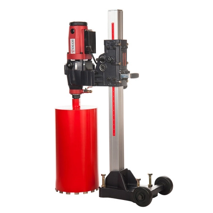 Подходит для выполнения большого объема работ по сверлению отверстий в железобетоне, блоках, кирпиче. Максимальный рекомендуемый диаметр сверления по железобетону до 300 мм, по кирпичу 355 мм. Машина снабжена механической фрикционной муфтой, которая защищает электродвигатель от резкой нагрузки (заклинивания коронки в бетоне).