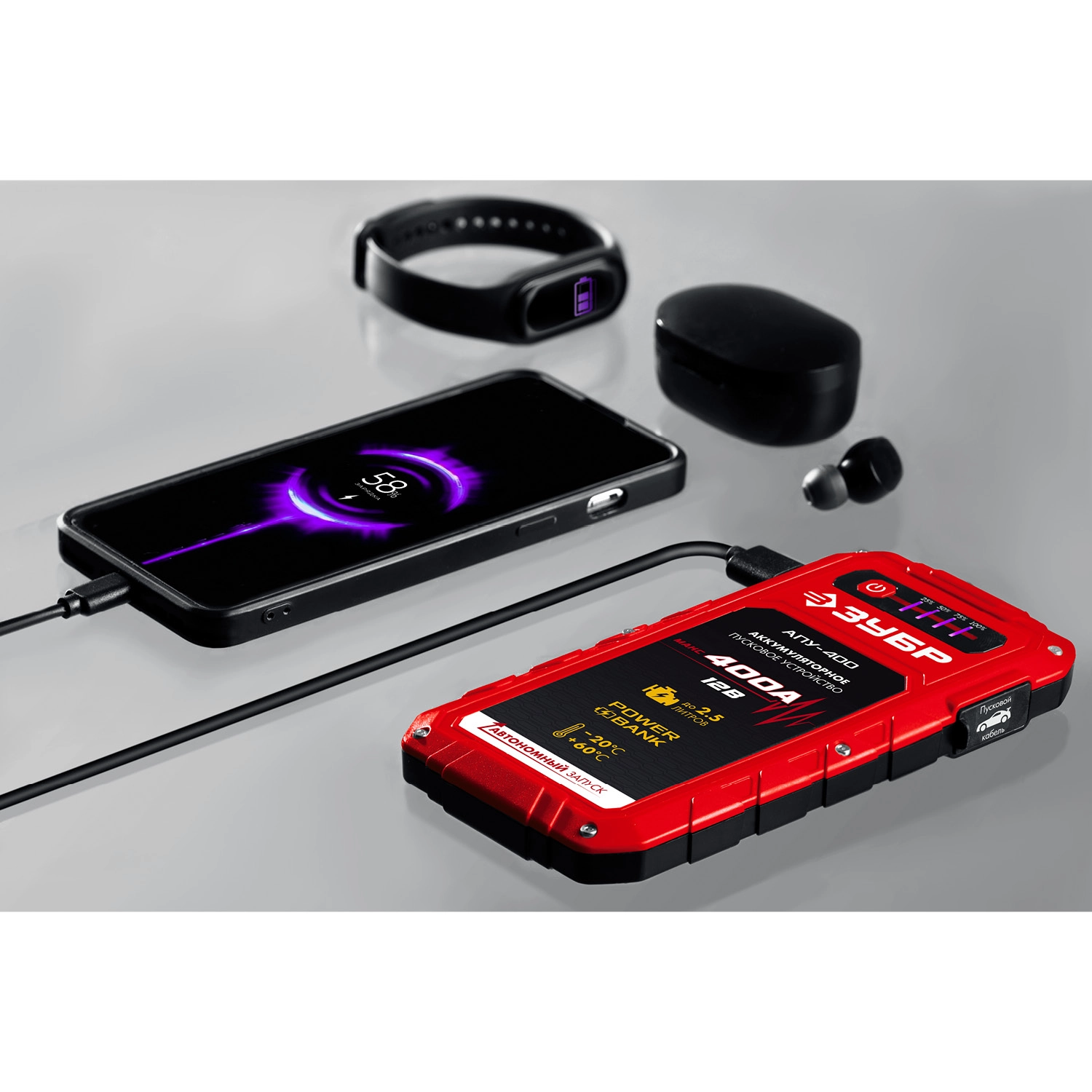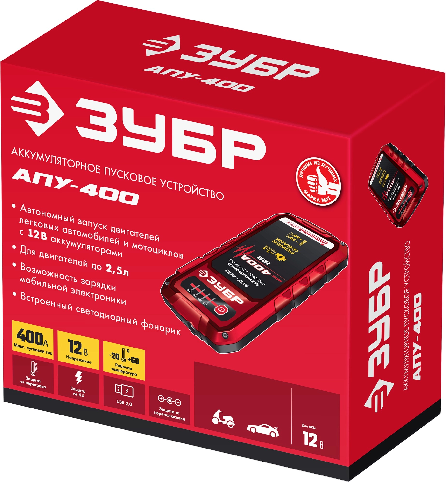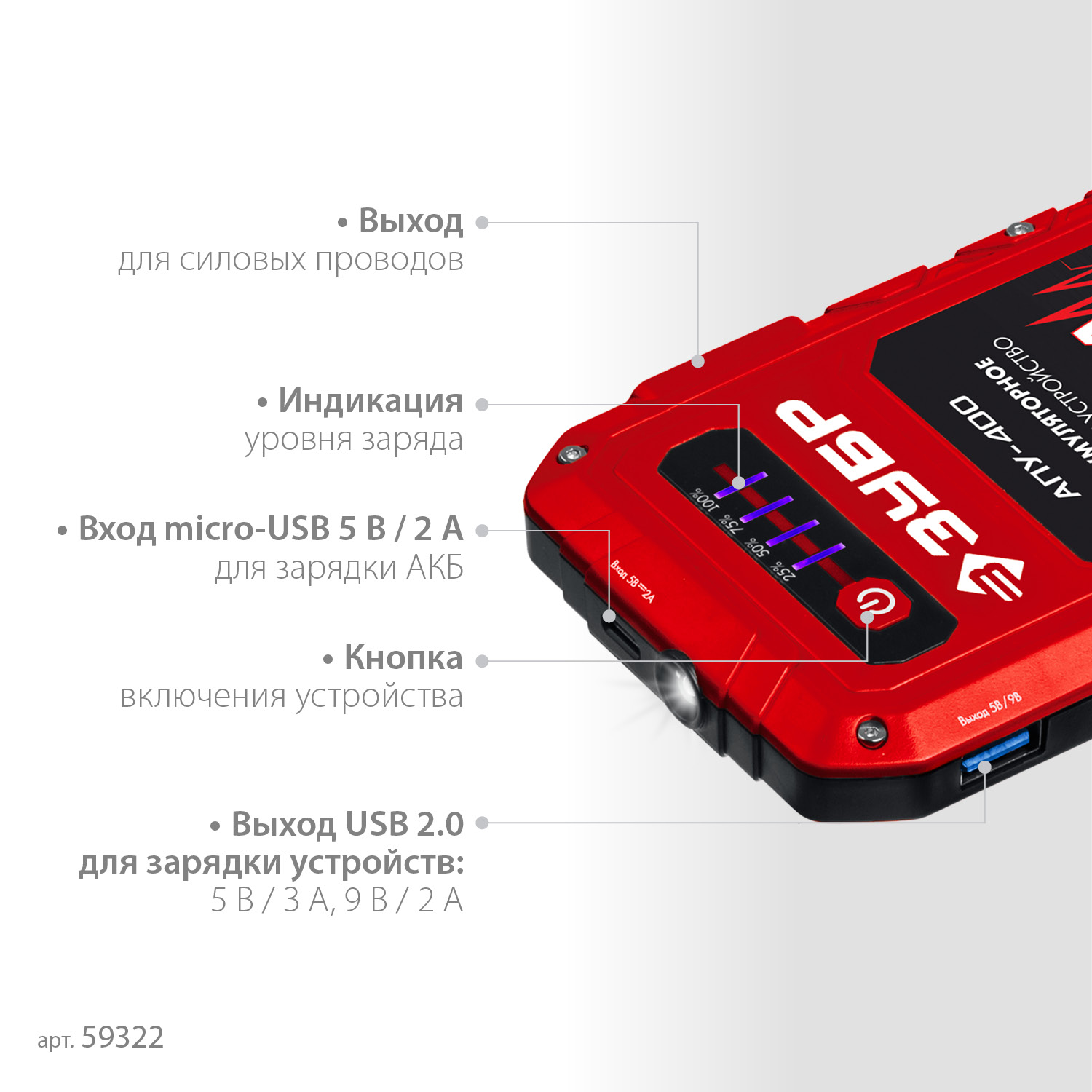 ПроизводителиУстройство пусковое,аккумуляторное,12В, макс. 400 А,АПУ-400 (59322) ЗУБР