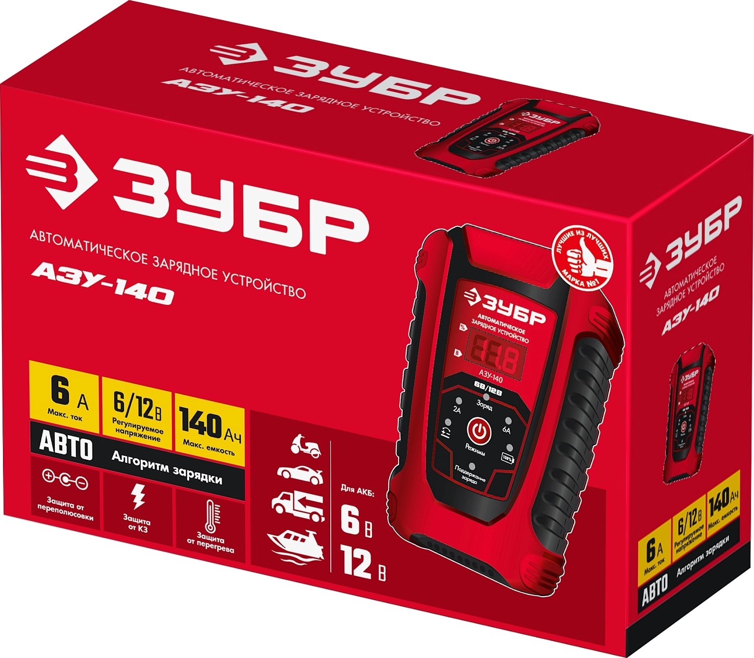 ПроизводителиУстройство зарядное автоматическое, 6/12В, 6 А,АЗ, АЗУ-140 (59310) ЗУБР