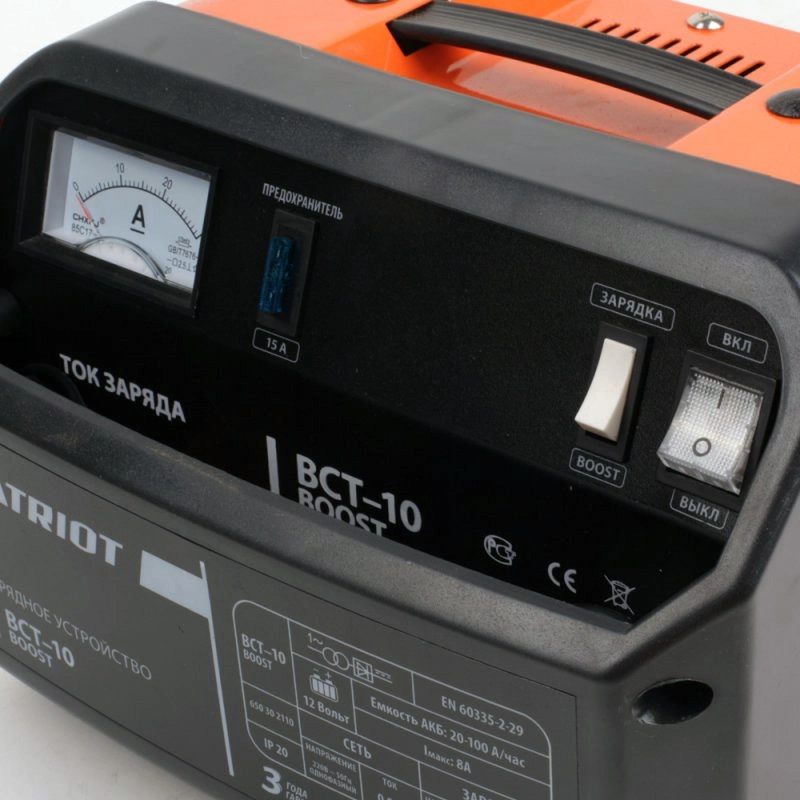 ЭКОНОМУровень качества. При классификации продуктов, имеющих схожее наименование, но обладающие различными потребительскими свойствами мы приняли следующий Вес факторов: 80% - подтвержденный ресурс, 15% - заявленная производительность/скорость, 5% - субъективные ощущения потребителя. ПодробнееКод товара: 0074452ХарактеристикиАртикул 650301510Бренды PATRIOTСтрана производства КитайГарантия 12 месяцевГабариты (ШхВхГ),мм 250х290х260Тип зарядноеНапряжение аккумулятора 12Температурный режим использования ˚С от -20 до +40Емкость аккумулятора 8.5Длина сетевого шнура 1.8Количество заряжаемых аккумуляторов, шт 1Наличие дисплея нетКоличество ступеней зарядки 1Вес 4.3Мин. Емкость заряжаемых батарей 20Номинальное напряжение батареи 12Мин. Ток зарядки 6Макс. Емкость заряжаемых батарей 100Макс. Ток зарядки 8Потребляемая мощность на заряд 100Напряжение 220Описание товара обновлено 28.01.2026 17:04:37Устройство для бытового полупрофессионального или профессионального использования. Предназначено для зарядки свинцовых, кислотных аккумуляторов напряжением 12В. Ускоренный режим зарядки с повышенным током. Устройство высокого качества, удобно в использовании, оснащено переключателем напряжения тока, амперметром, защитой от перегрузки, неправильной полярности, короткого замыкания. Отсек для хранения проводов.Производитель: 11th Flooor,LiYuanShangdu Building A2,201# LanTian Road,NingBo China