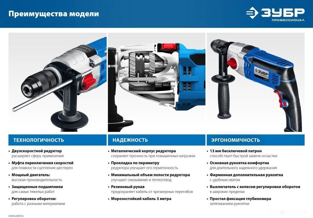 Дрель безударная электрическая ЗУБР Д-П900-2, предназначена для сверления отверстий в различных материалах (дерево, сталь и т. д.) при установке соответствующих сверл. Профессиональная дрель с мощным двигателем, двумя скоростными диапазонами, продуманной эргономикой и удобной дополнительной рукояткой. Корпус редуктора из литого под давлением алюминия обладает повышенной прочностью, обеспечивает лучший теплоотвод и увеличивает надежность вследствие стабильности геометрических размеров. Плавная электронная регулировка оборотов в широком диапазоне вместе с двумя ступенями редуктора дают широкие возможности настройки режима работы для любого материала и расходного инструмента. Шестерни из хромового сплава продлевают срок жизни передаточного механизма. Кабель в резиновой изоляции с водоотталкивающей пропиткой не ″дубеет″ на морозе.Производитель: Крафтул И/Е Гмбх, Альтер Поствег Штр., Лоенинген, Германия