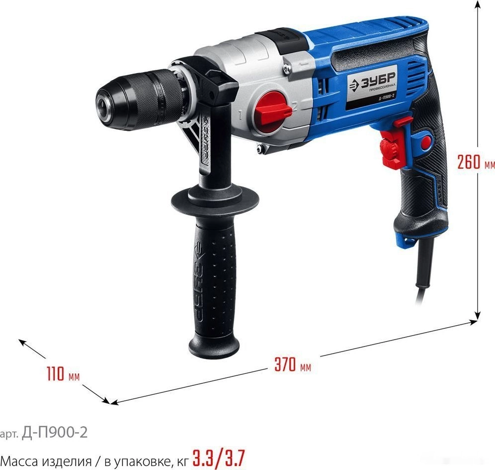 ПРОФИУровень качества. При классификации продуктов, имеющих схожее наименование, но обладающие различными потребительскими свойствами мы приняли следующий Вес факторов: 80% - подтвержденный ресурс, 15% - заявленная производительность/скорость, 5% - субъективные ощущения потребителя. ПодробнееКод товара: 0082091(1)ХарактеристикиАртикул УЦЕН. Д-П900-2Бренды ЗубрСтрана производства КитайТип безударная дрельМакс. диаметр сверления, дерево 35Макс. диаметр сверления, металл 13Диаметр патрона 13Режимы работы сверлениеВес 3300Питание сетьПатрон быстрозажимнойРежимы скорости вращения 2Реверс естьДополнительная рукоятка естьКейс нетПодсветка нетСверла нетФиксация кнопки включения ДаРегулировка оборотов ДаОписание товара обновлено 08.12.2025 15:09:45После гарантийного ремонта.