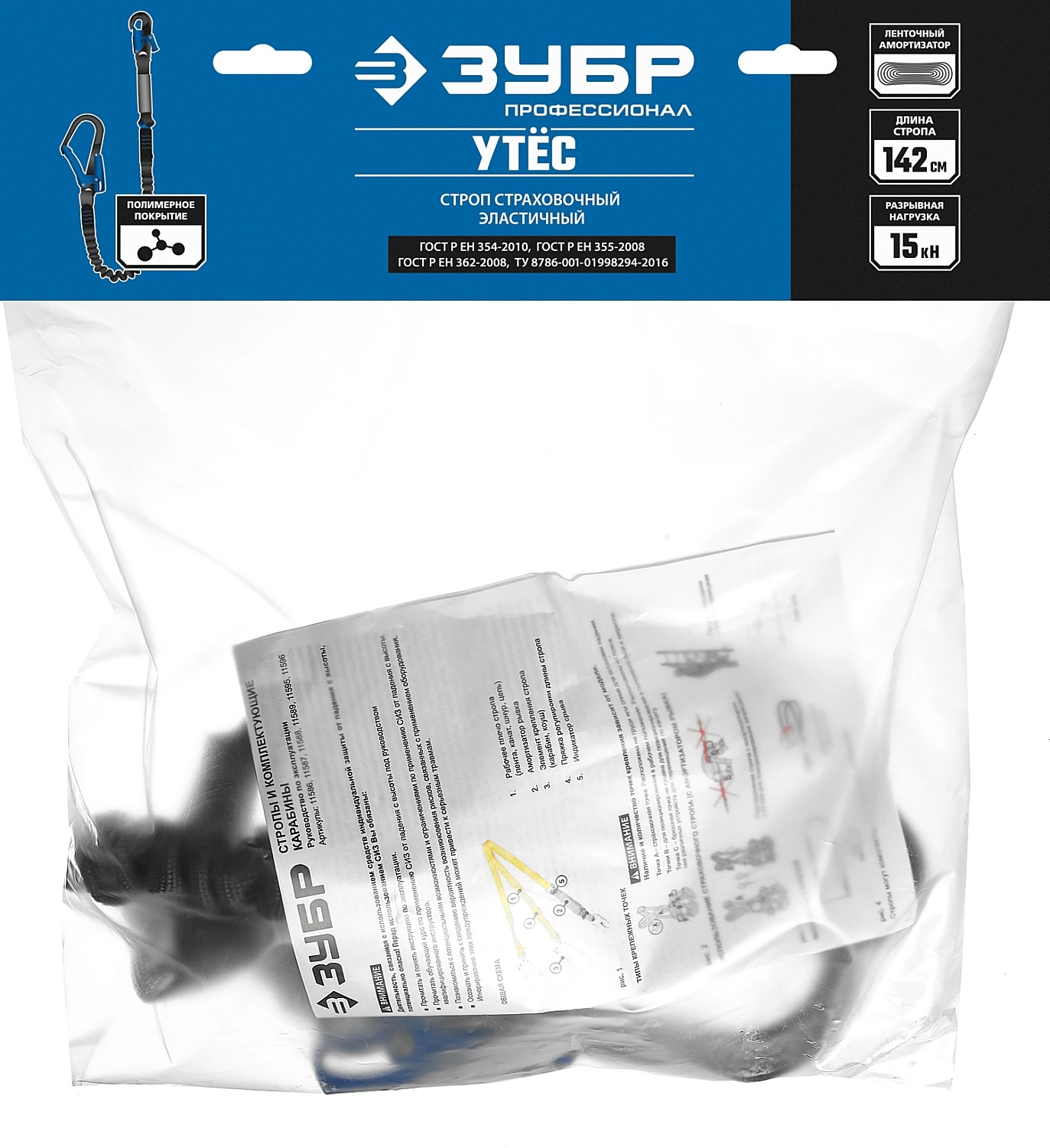 ПроизводителиCтроп одноплечный эластичный, 1.42м, разрывной ленточный амортизатор, стальные карабины (11595) ЗУБР