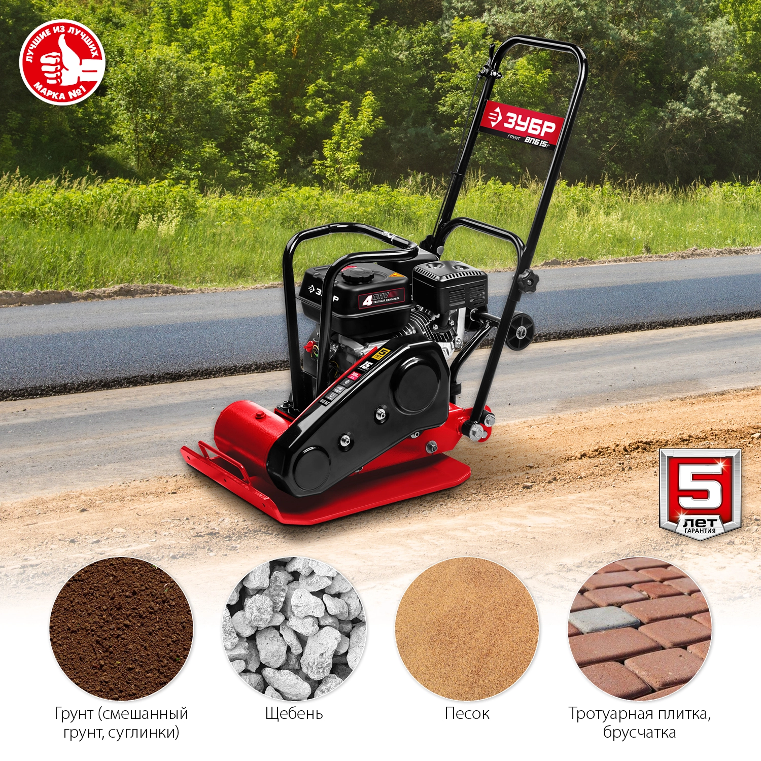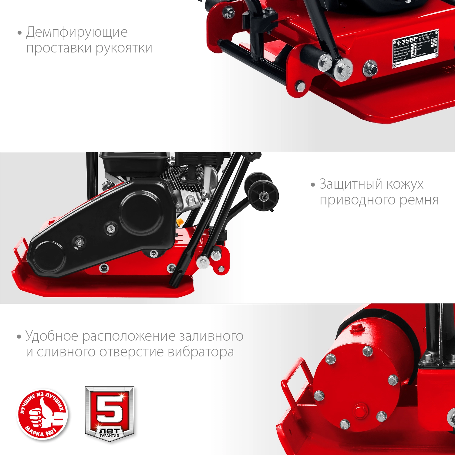 ПРОФИУровень качества. При классификации продуктов, имеющих схожее наименование, но обладающие различными потребительскими свойствами мы приняли следующий Вес факторов: 80% - подтвержденный ресурс, 15% - заявленная производительность/скорость, 5% - субъективные ощущения потребителя. ПодробнееКод товара: 0048425(0)Виброплита ЗУБР ВПБ-15 Г, предназначена для уплотнения бетонных, асфальтовых и сыпучих материалов, а также для формирования уплотненных поверхностей. Экономичный высокоресурсный 4х тактный двигатель "Зубр" с большим межсервисным пробегом. Оптимальная центробежная сила для утрамбовки грунта и прочих сыпучих и мягких материалов. Демпфирующие проставки рукоятки для защиты оператора от вибраций. Индустриальные подшипники вибратора обеспечивают повышенную надежность самого нагруженного узла. Дополнительная силовая рама защищает двигатель при транспортировке и погрузке. Регулятор дросселя всегда под рукой на рукоятке, что облегчает эксплуатацию. Складывающаяся ручка для экономии пространства. Защитный кожух ремня позволяет надежно защитить оператора от опасности контакта, а сам ремень - от повреждений камнями. КОМПЛЕКТАЦИЯ: