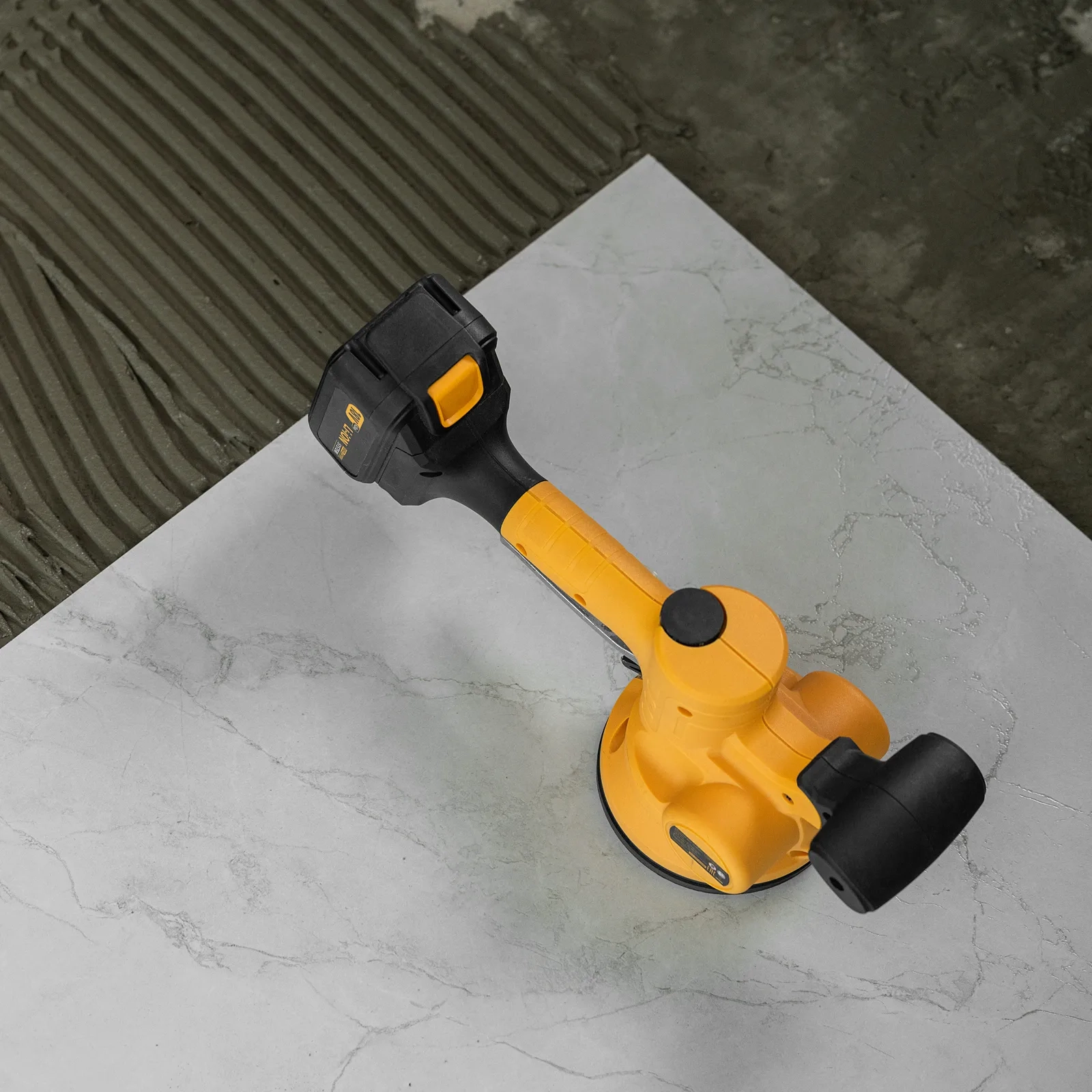 Машина для укладки плитки Denzel TTM-130-0 28481 работает от аккумуляторной батареи Li-Ion емкостью 2 А/ч, с рабочим напряжением 18 В, и используется для проведения облицовочных работ. При помощи присоски диаметром 130 мм оказывает вибрационное воздействие на поверхность плитки со скоростью 500-12000 об/мин, что способствует равномерному распределению клея, а также препятствует образованию воздушных пузырьков и полостей под плиткой, позволяя избежать ее перекоса и повреждения.;Машина поставляется без АКБ и зарядного устройства, на нее можно установить универсальный аккумулятор, совместимый с любым инструментом единой платформы Denzel battery system 18V серии IB.