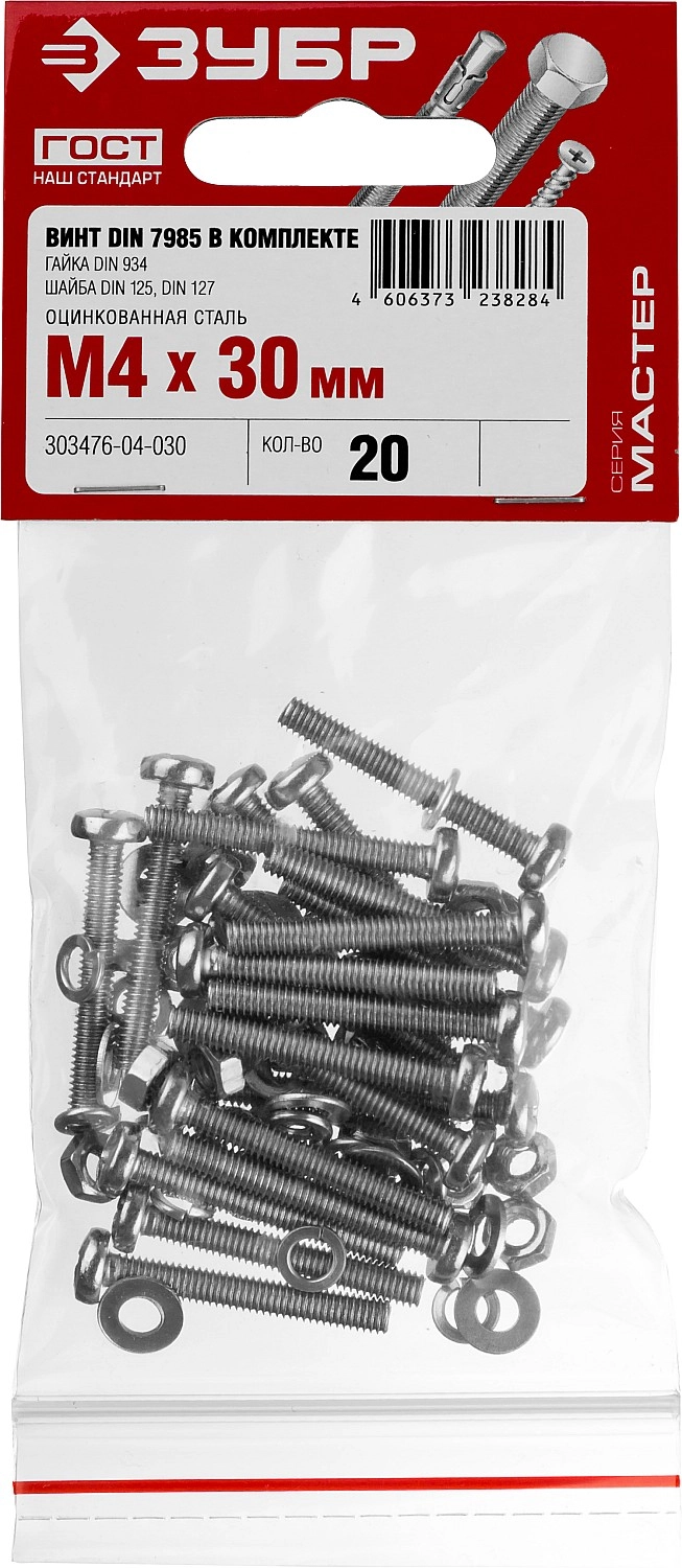ПроизводителиКомплект (винт, гайка, шайба, гровер) DIN7985,934,125,127 оцинк. M4x30, 20шт. (303476-04-030) ЗУБР