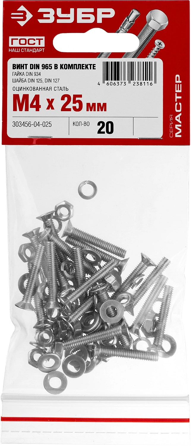 ПроизводителиКомплект (винт, гайка, шайба, гровер) DIN965,934,125,127 оцинк. M4x25, 20шт. (303456-04-025) ЗУБР