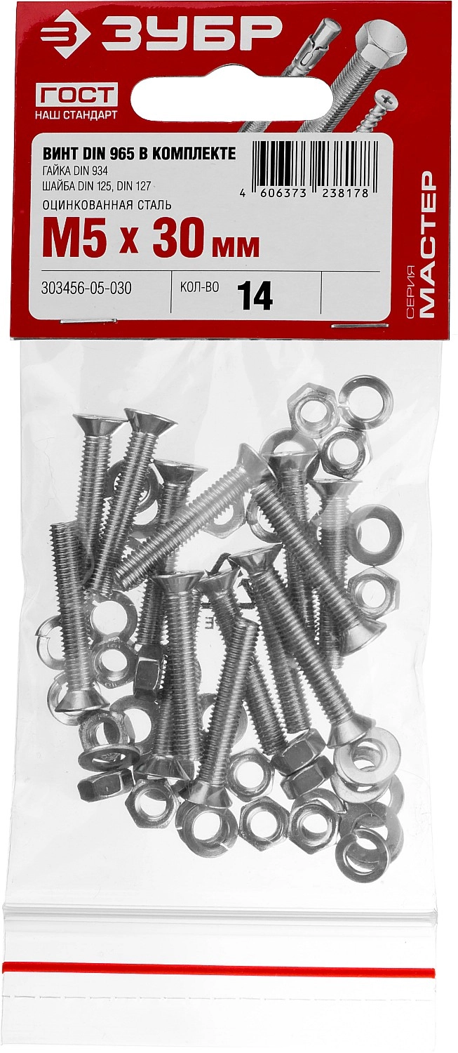 ПроизводителиКомплект (винт, гайка, шайба, гровер) DIN965,934,125,127 оцинк. M5x30, 14шт. (303456-05-030) ЗУБР