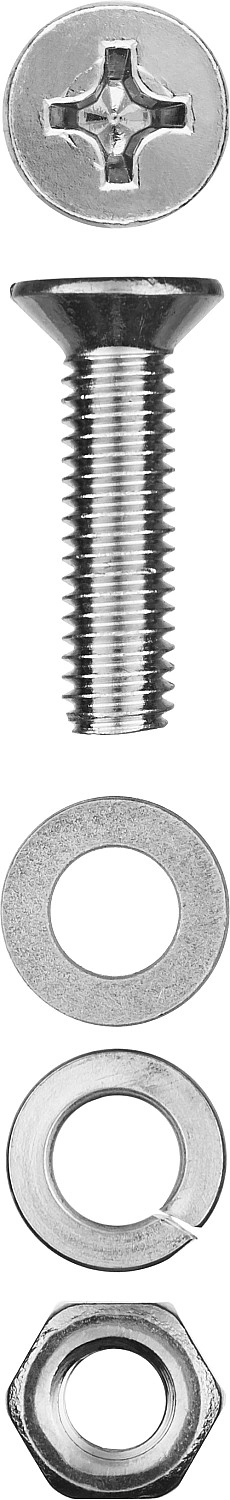 Набор состоит из винтов с потайной головкой DIN 965, гаек шестигранных DIN 934, гроверных шайб DIN 127 и плоских шайб DIN 125;