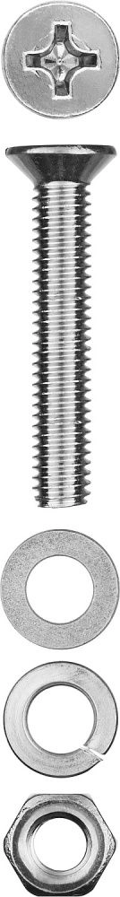Набор состоит из винтов с потайной головкой DIN 965, гаек шестигранных DIN 934, гроверных шайб DIN 127 и плоских шайб DIN 125;