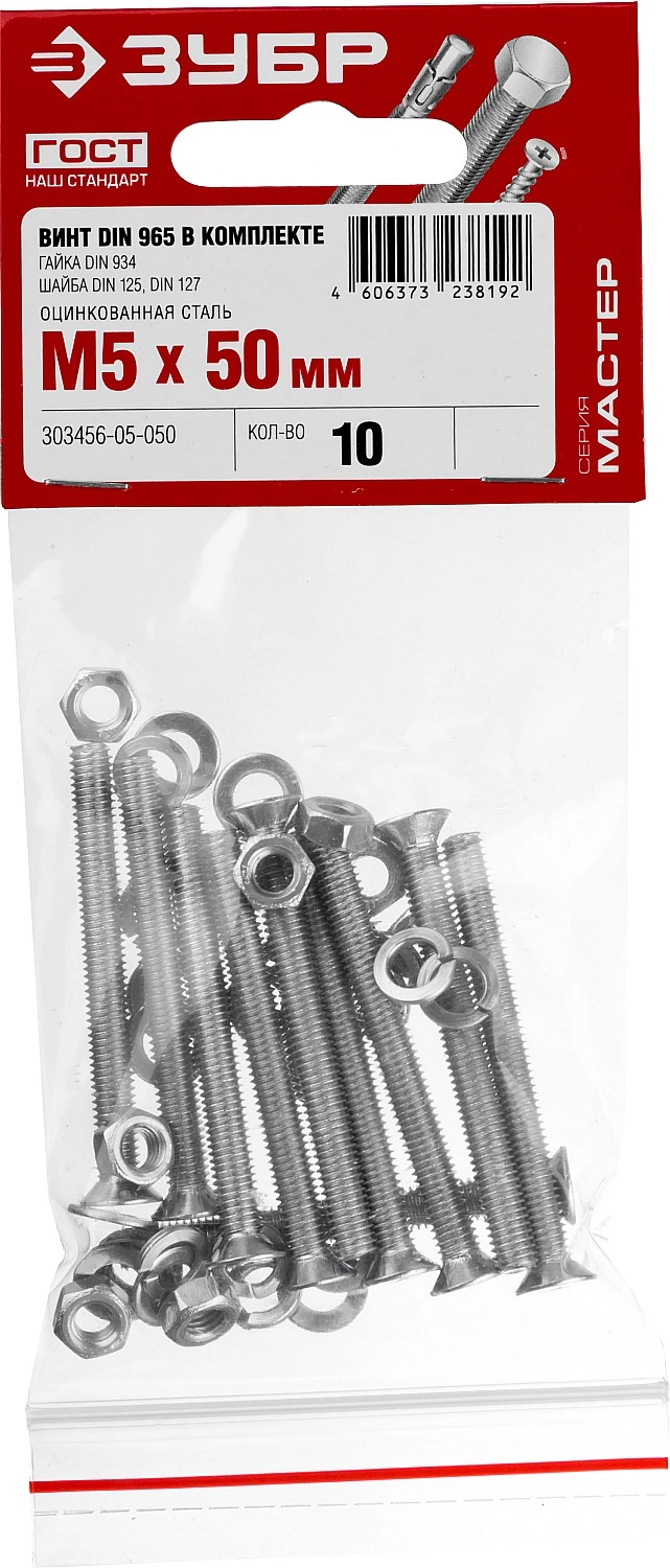 ПроизводителиКомплект (винт, гайка, шайба, гровер) DIN965,934,125,127 оцинк. M5x50, 10шт. (303456-05-050) ЗУБР