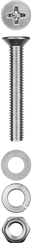 Набор состоит из винтов с потайной головкой DIN 965, гаек шестигранных DIN 934, гроверных шайб DIN 127 и плоских шайб DIN 125;