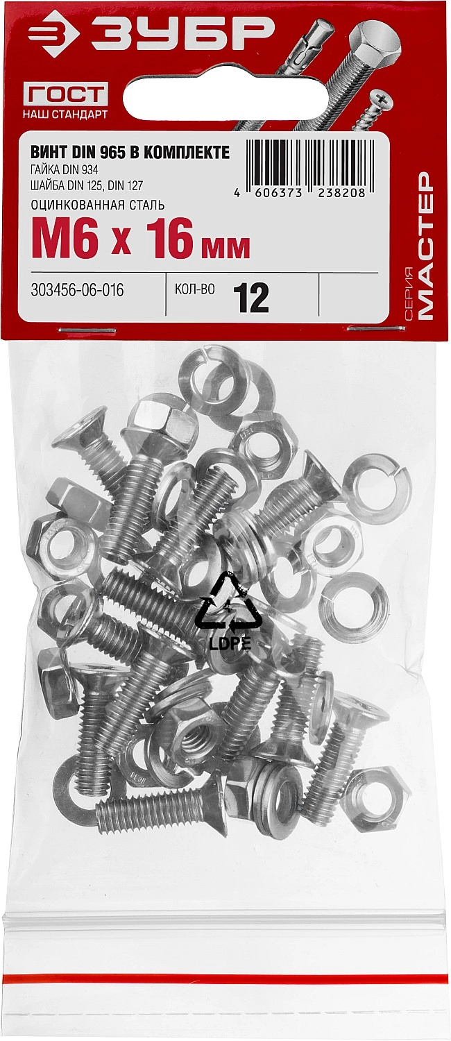 ПроизводителиКомплект (винт, гайка, шайба, гровер) DIN965,934,125,127 оцинк. M6x16, 12шт. (303456-06-016) ЗУБР