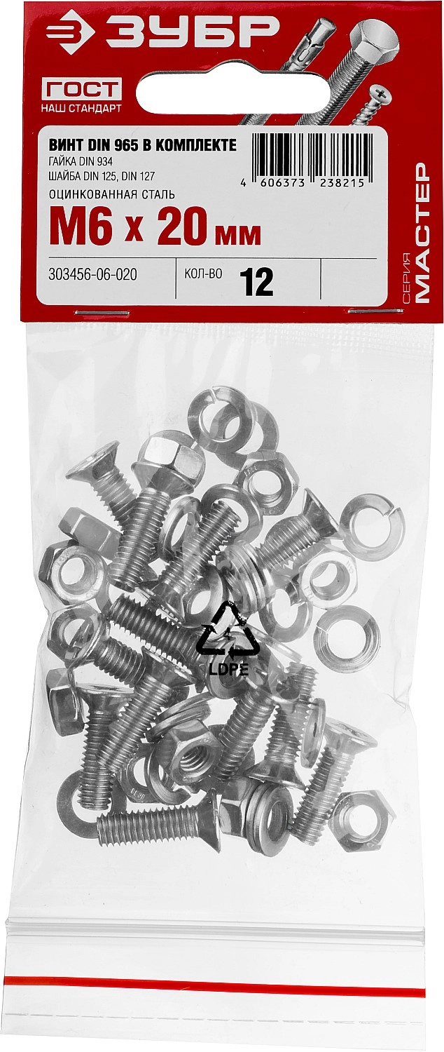 ПроизводителиКомплект (винт, гайка, шайба, гровер) DIN965,934,125,127 оцинк. M6x20, 12шт. (303456-06-020) ЗУБР